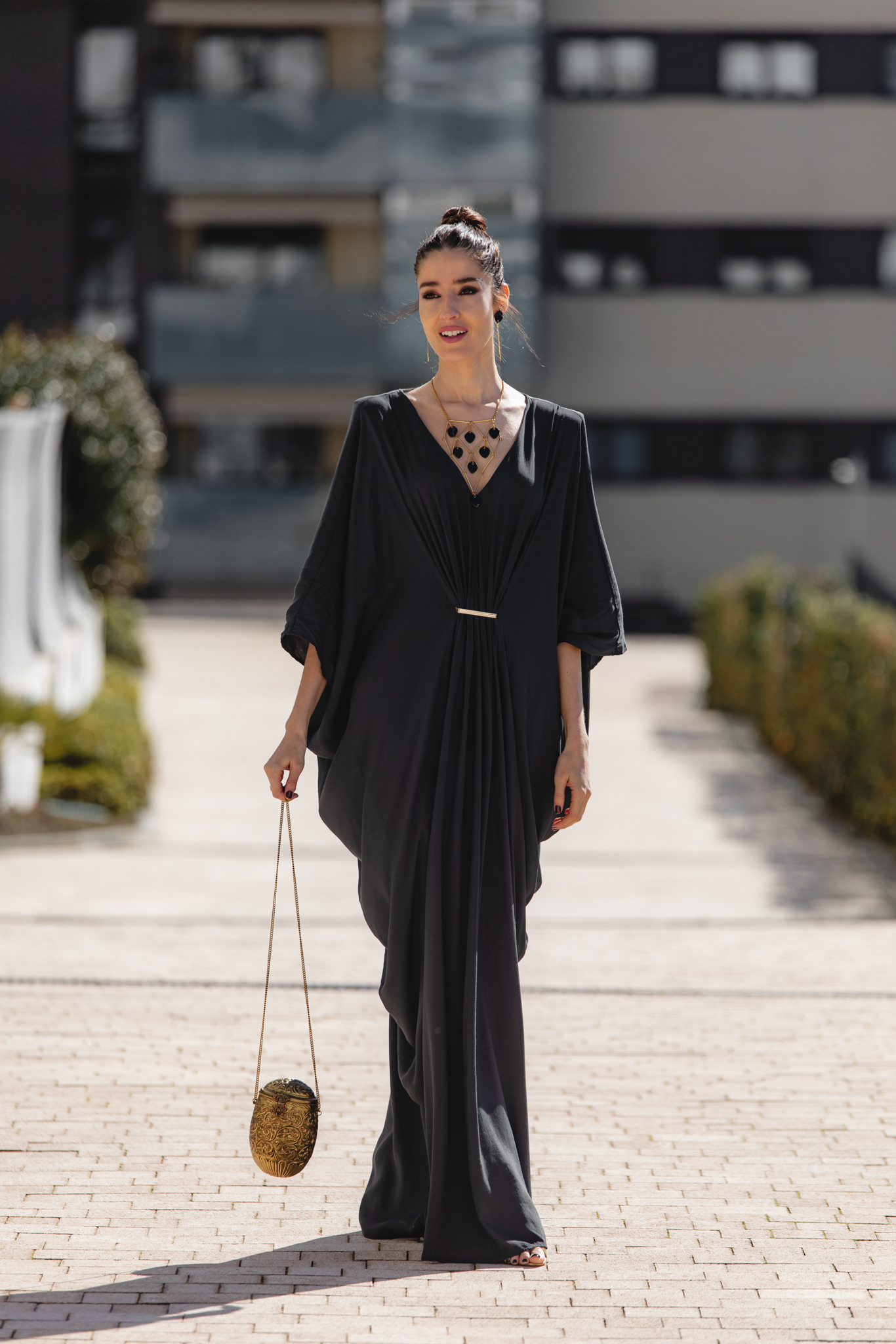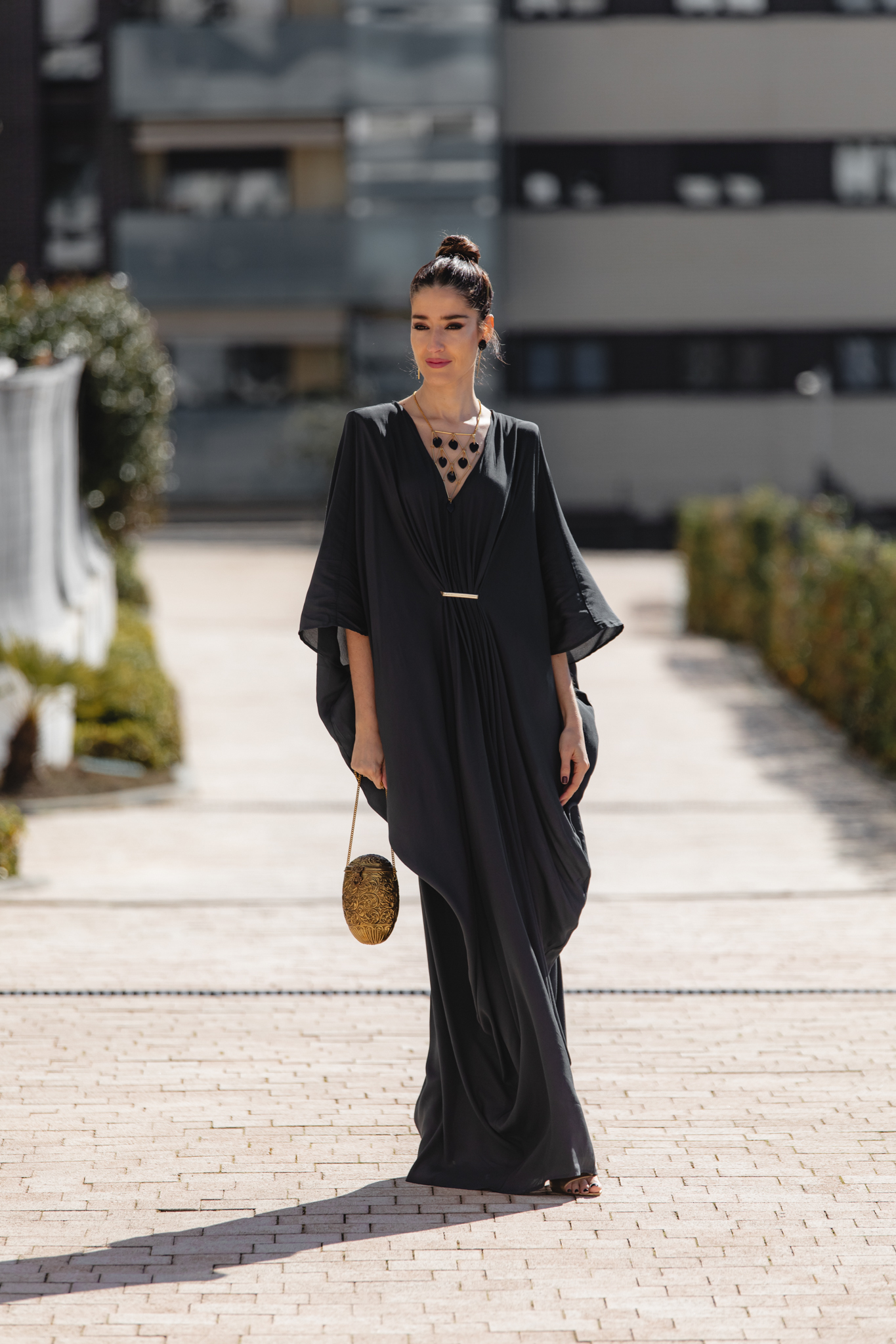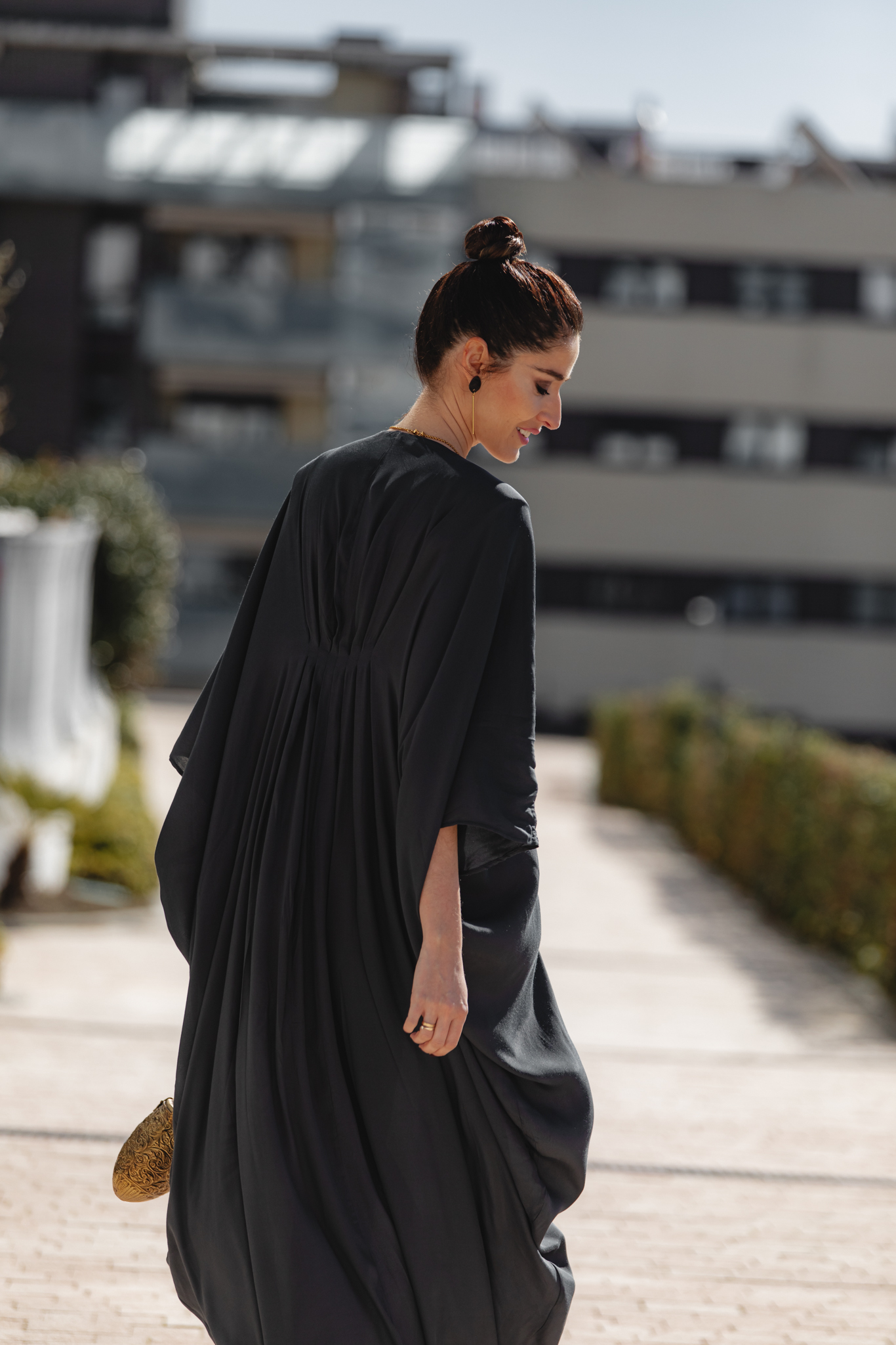 Lo primero que me enamoró fue su caída, tan limpia y favorecedora, y el movimiento que tiene al caminar. Es de esos vestidos que crean una silueta estilizada, relajada y muy sofisticada con cada paso. El drapeado central ayuda a estilizar visualmente y recoge la figura sin marcar en exceso, lo que lo convierte en una opción comodísima si priorizáis la comodidad. Además, su corte amplio y fluido lo hace perfecto para invitadas embarazadas, ya que se adapta con facilidad a los diferentes meses de gestación sin perder armonía ni elegancia.