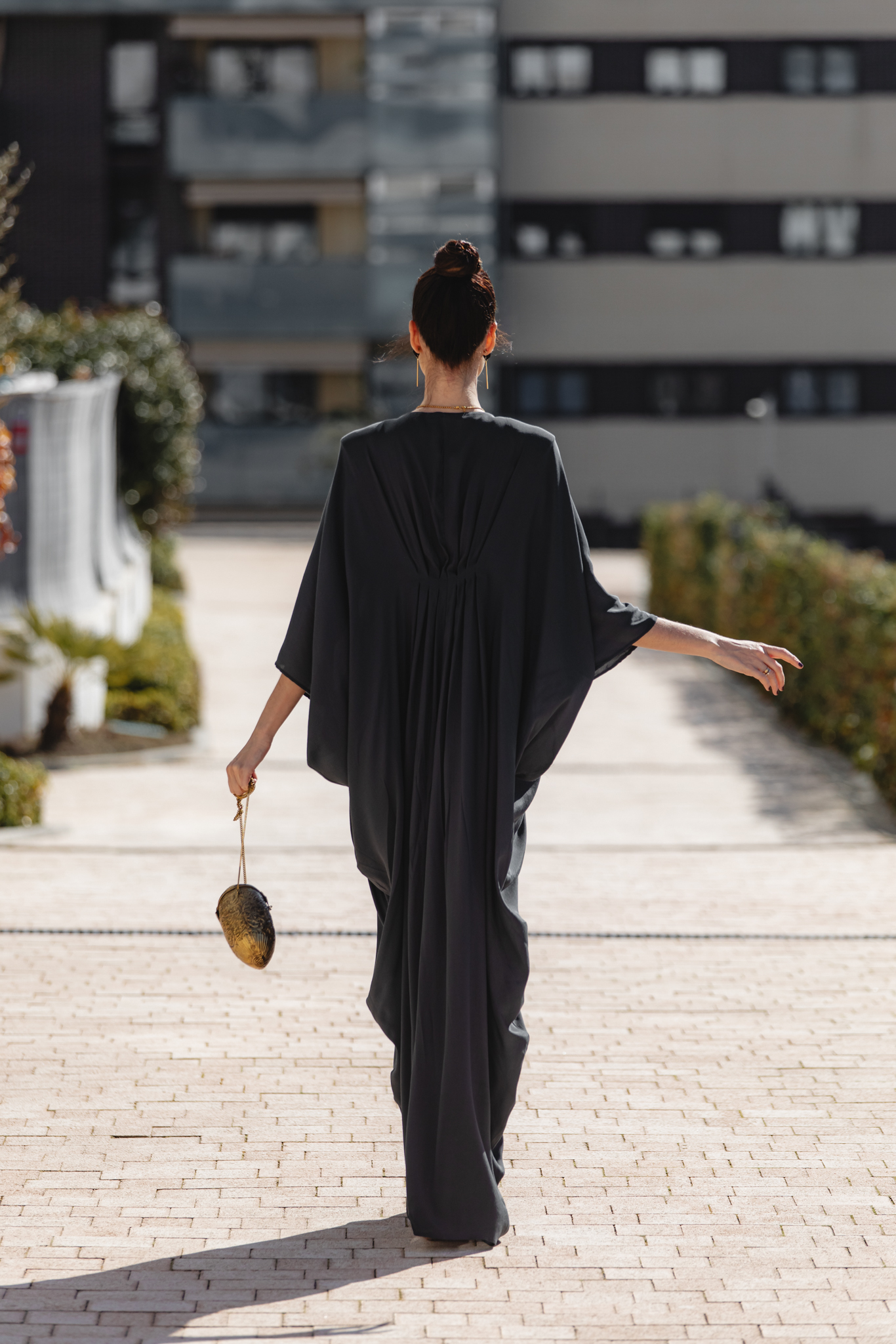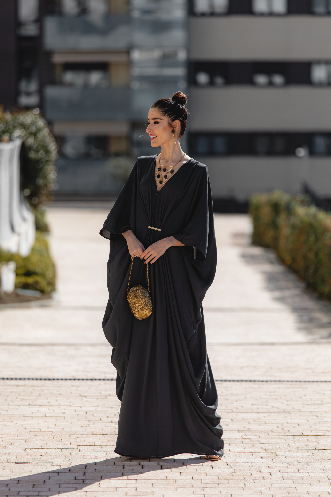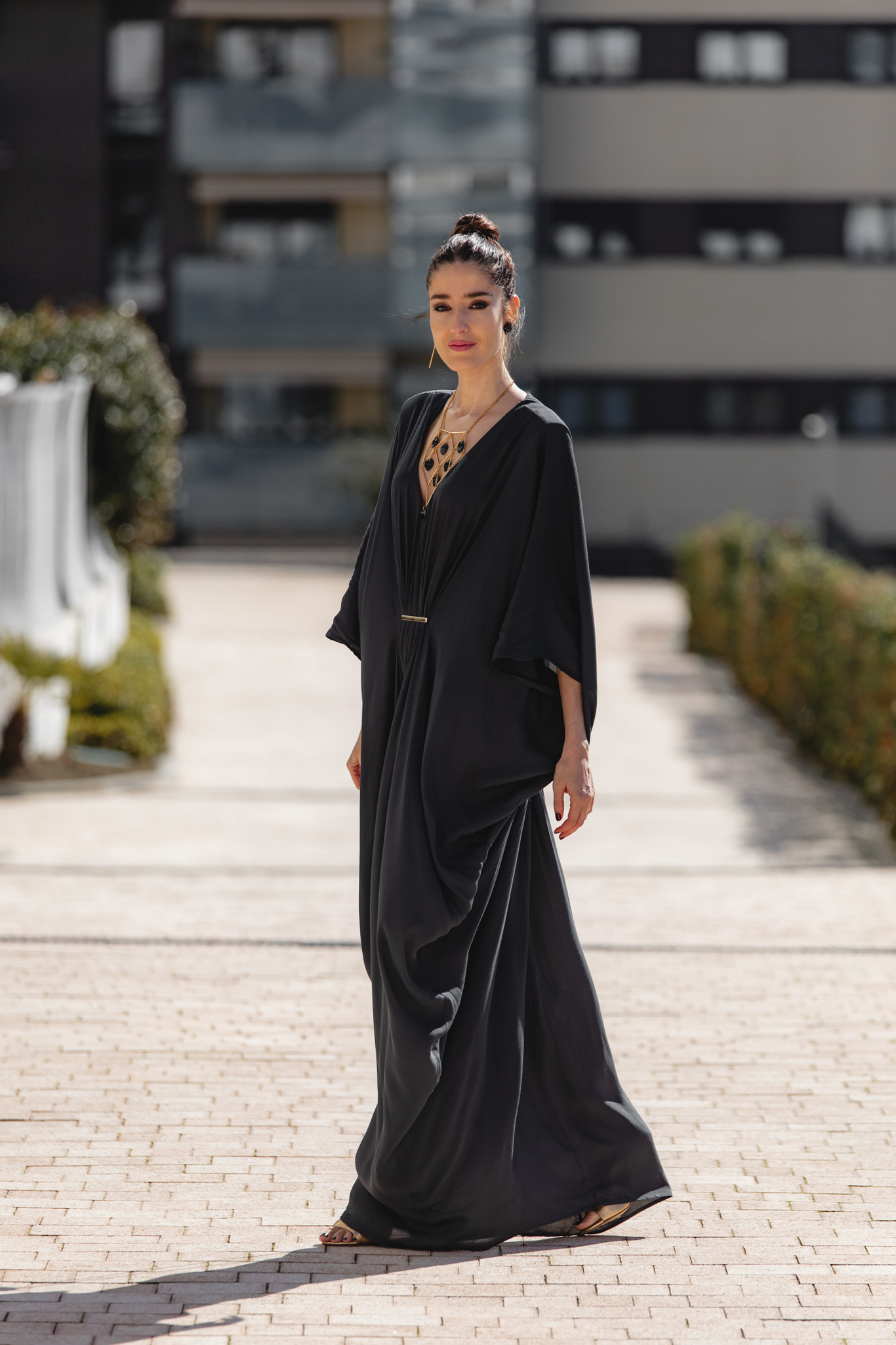 Lo primero que me enamoró fue su caída, tan limpia y favorecedora, y el movimiento que tiene al caminar. Es de esos vestidos que crean una silueta estilizada, relajada y muy sofisticada con cada paso. El drapeado central ayuda a estilizar visualmente y recoge la figura sin marcar en exceso, lo que lo convierte en una opción comodísima si priorizáis la comodidad. Además, su corte amplio y fluido lo hace perfecto para invitadas embarazadas, ya que se adapta con facilidad a los diferentes meses de gestación sin perder armonía ni elegancia.