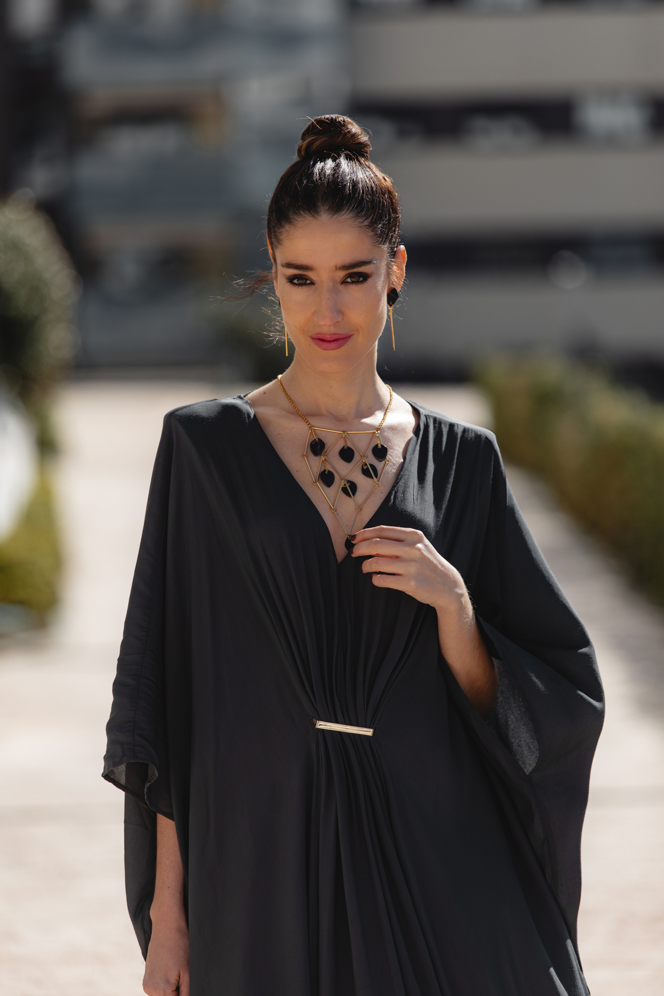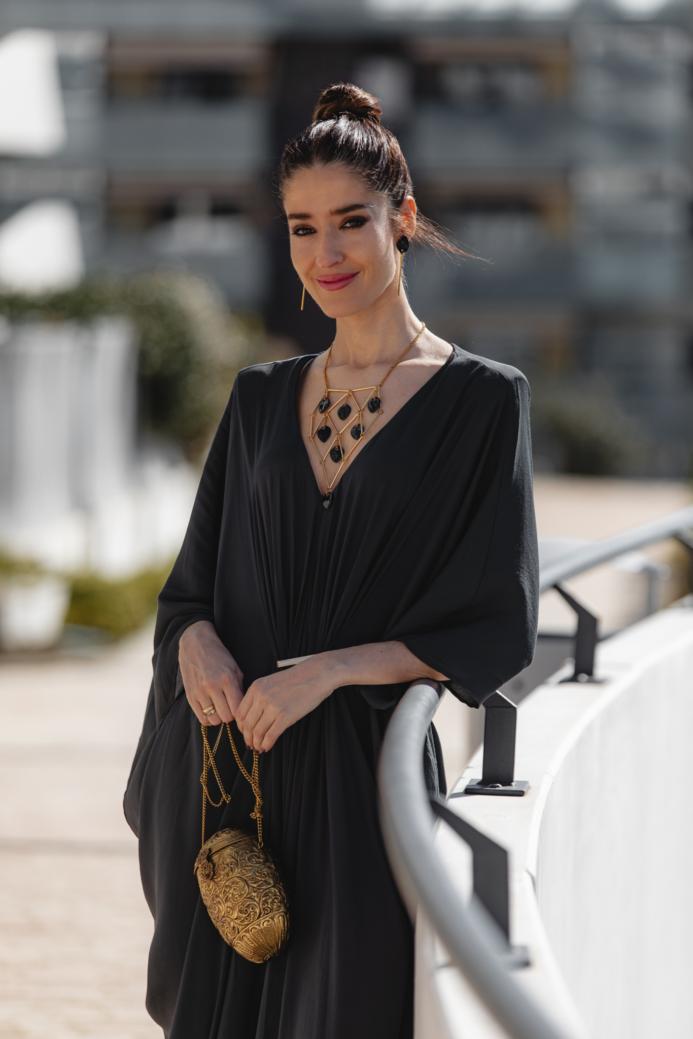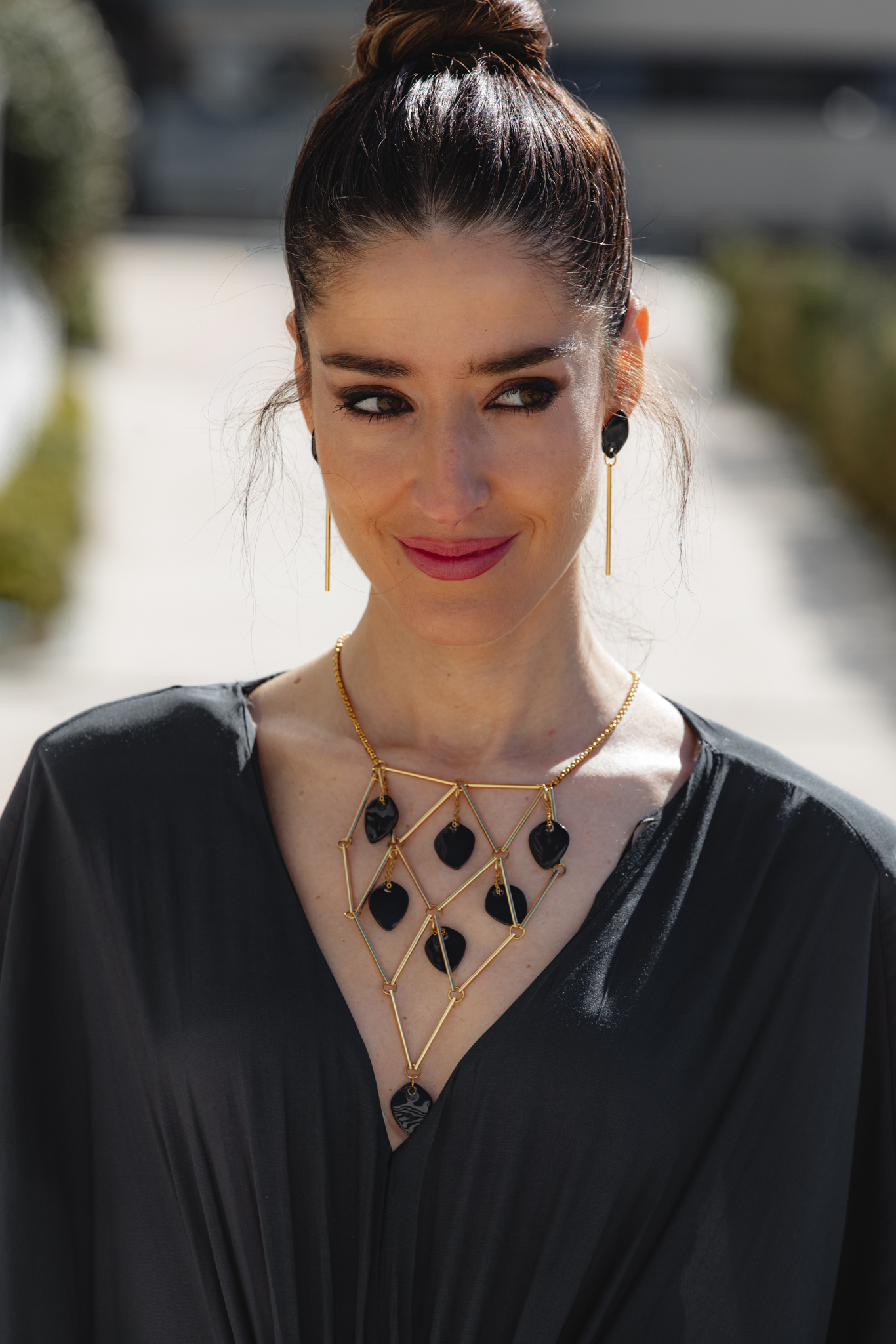 Para los accesorios, decidí potenciar el pequeño detalle dorado del vestido y construir todo el estilismo alrededor de piezas que aportaran luz a un tono tan oscuro. Las joyas de cerámica de Pimpampum fueron la elección perfecta: un conjunto precioso, con pendientes súper ligeros que no pesan nada y un collar espectacular que realza todo el estilismo sin competir con él.