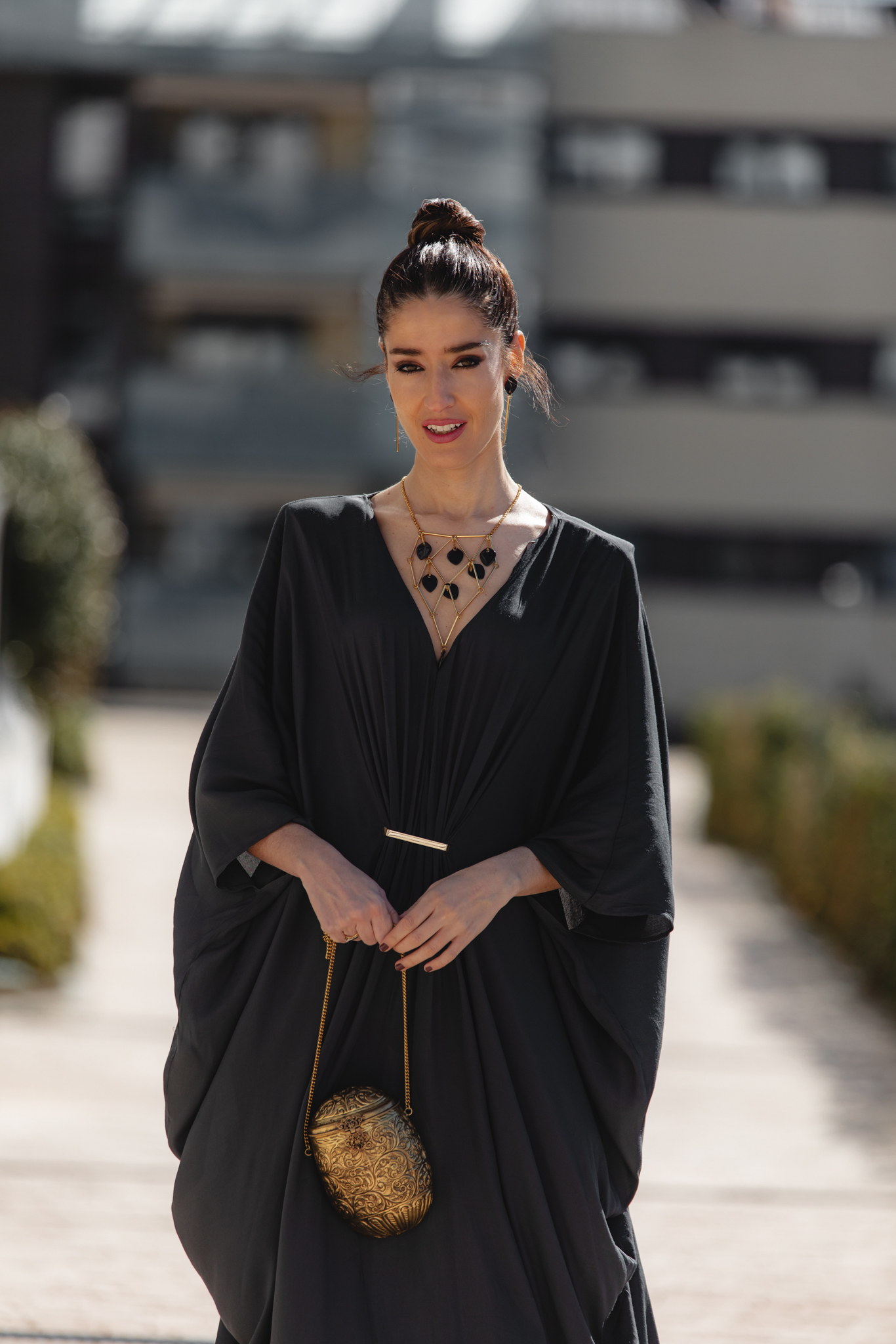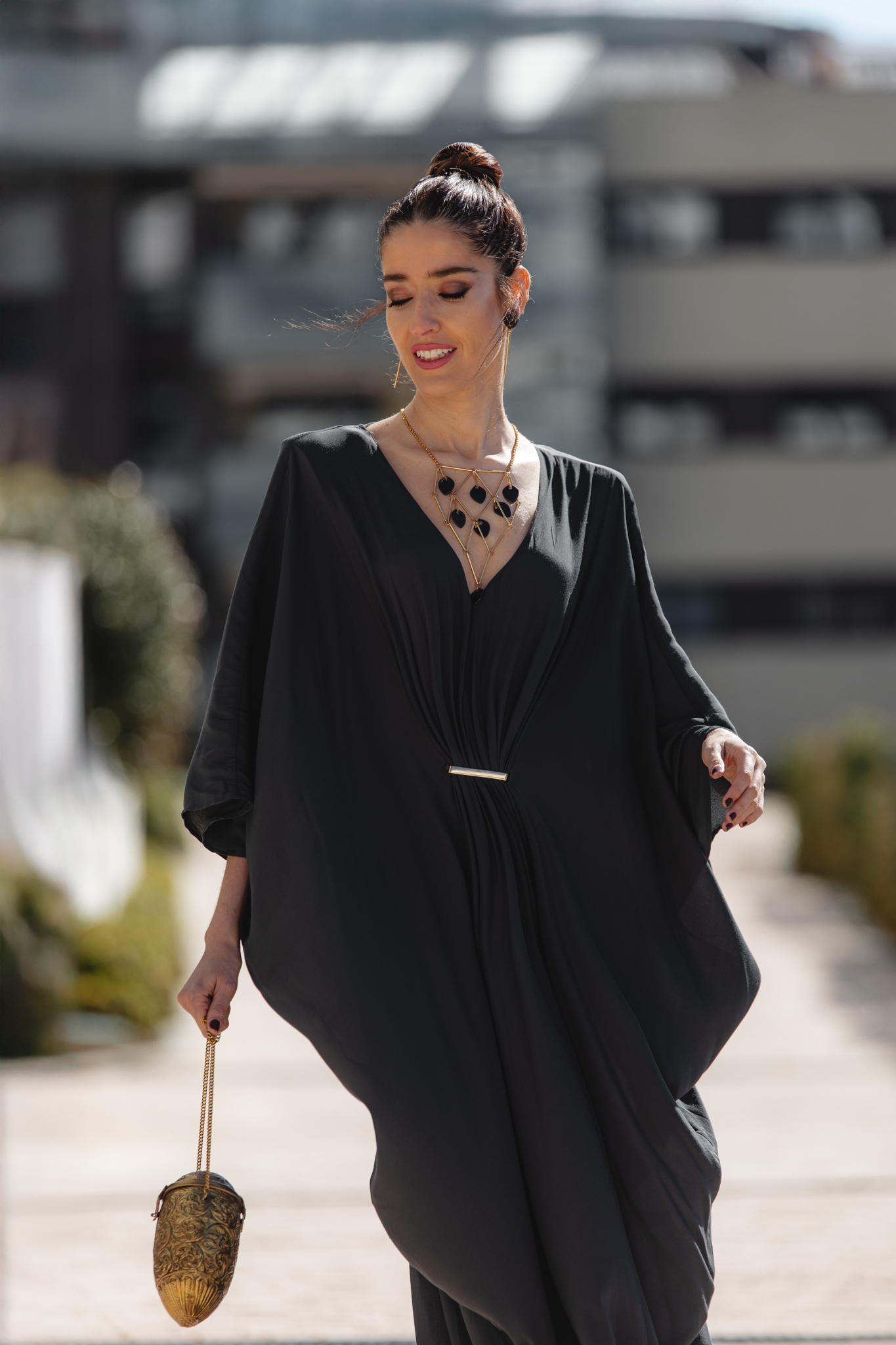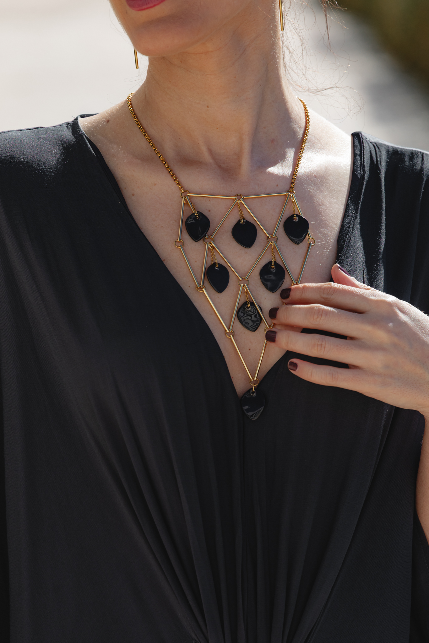 Para los accesorios, decidí potenciar el pequeño detalle dorado del vestido y construir todo el estilismo alrededor de piezas que aportaran luz a un tono tan oscuro. Las joyas de cerámica de Pimpampum fueron la elección perfecta: un conjunto precioso, con pendientes súper ligeros que no pesan nada y un collar espectacular que realza todo el estilismo sin competir con él.