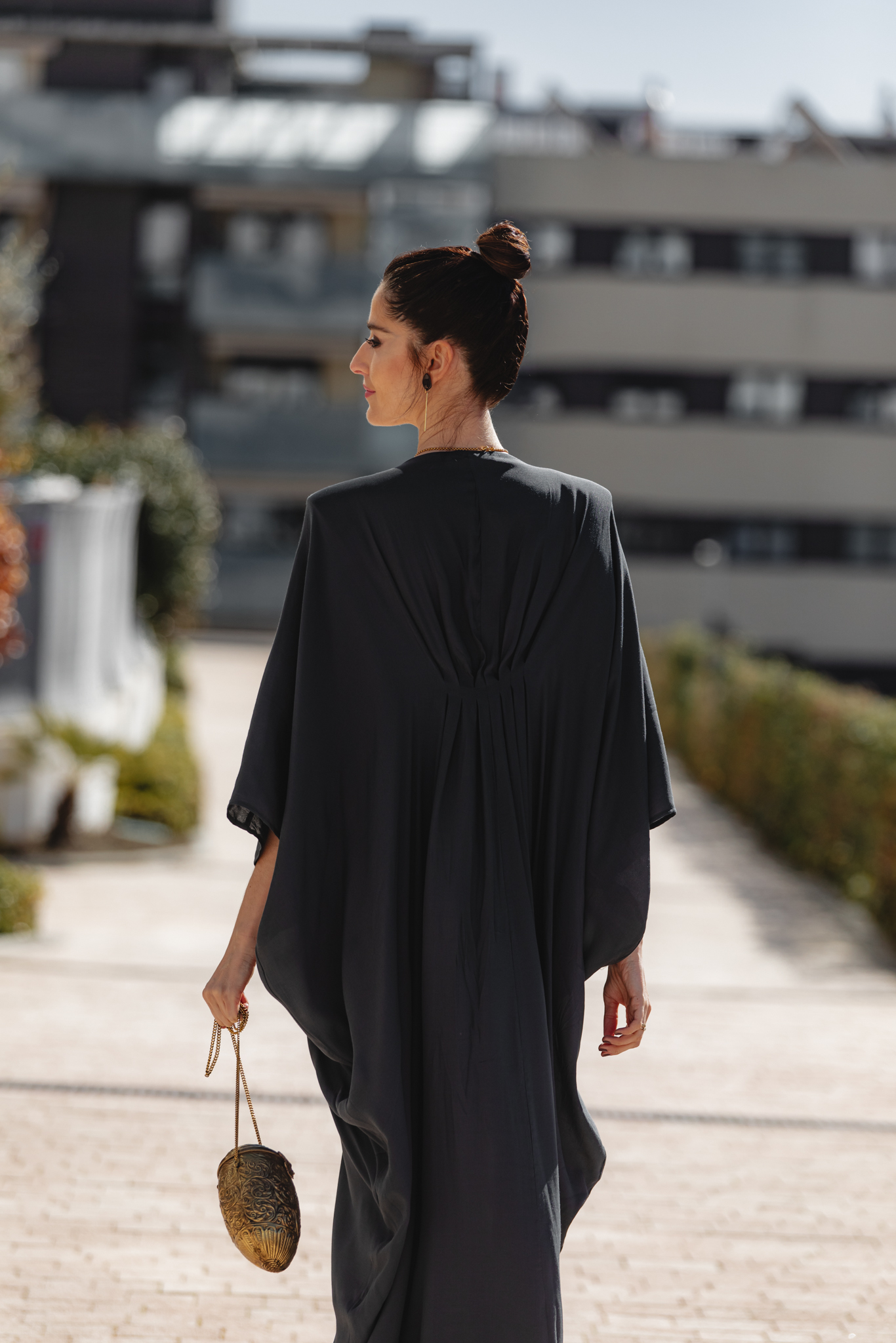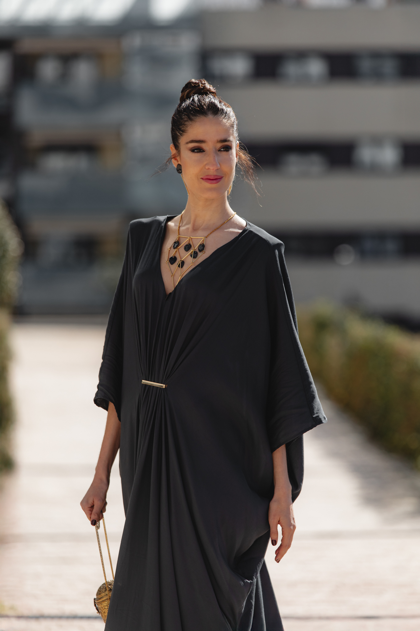 El resultado es un estilismo fluido, elegante y con muchísima personalidad, ideal para quienes buscáis un vestido diferente en gris antracita y queréis sentiros cómodas, seguras y muy guapas en un día importante.