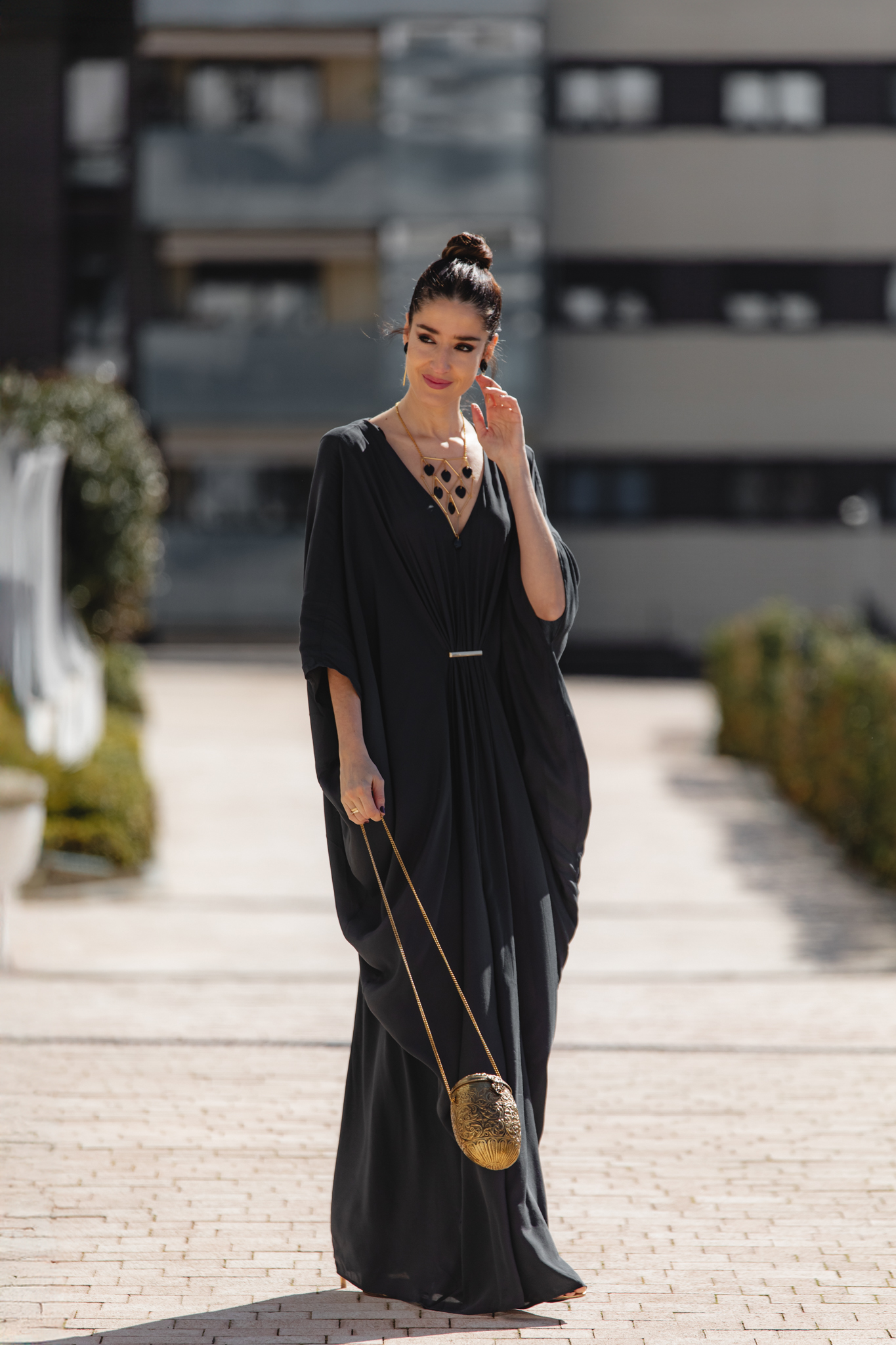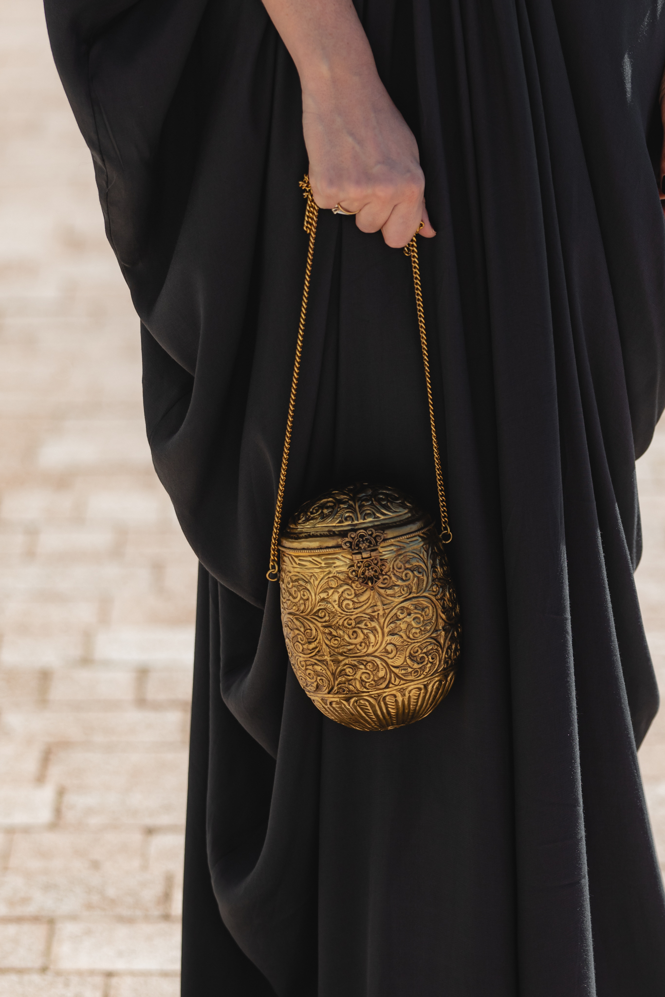 El bolso, una bombonera de latón que tengo desde hace años, añade textura y ese punto atemporal que tanto me gusta en los looks de noche. Y para rematar, las sandalias doradas de Salo Madrid, finas, elegantes y con ese brillo sutil que estiliza y acompaña el movimiento del vestido sin restarle protagonismo.