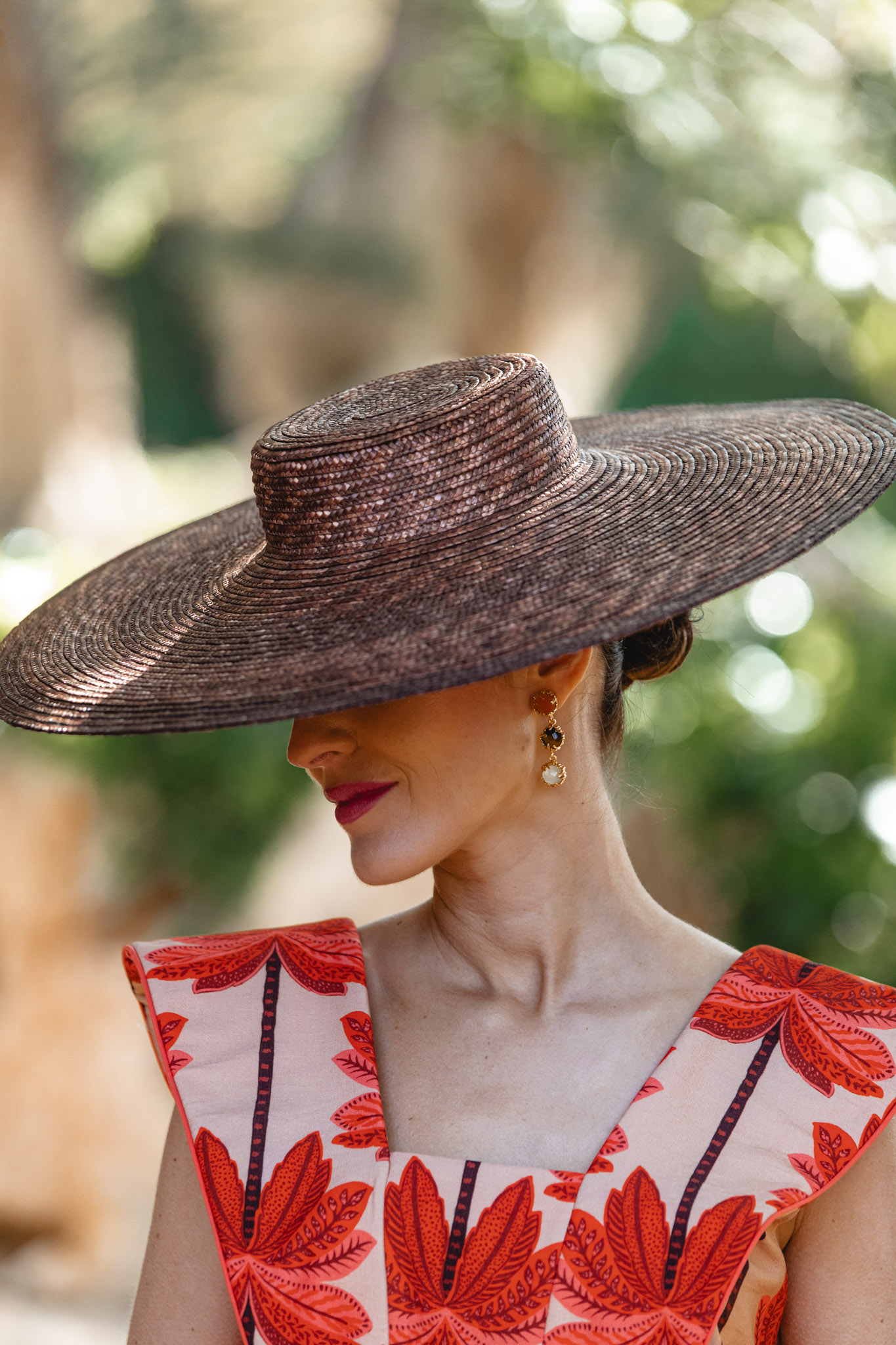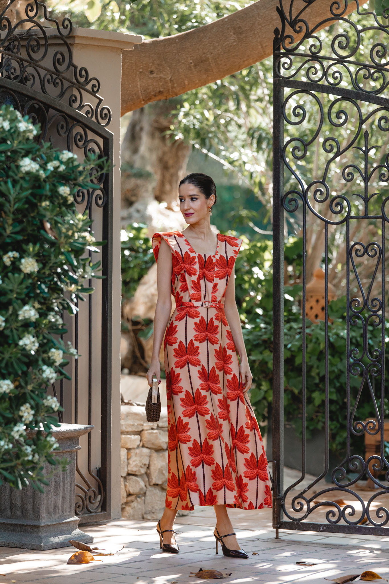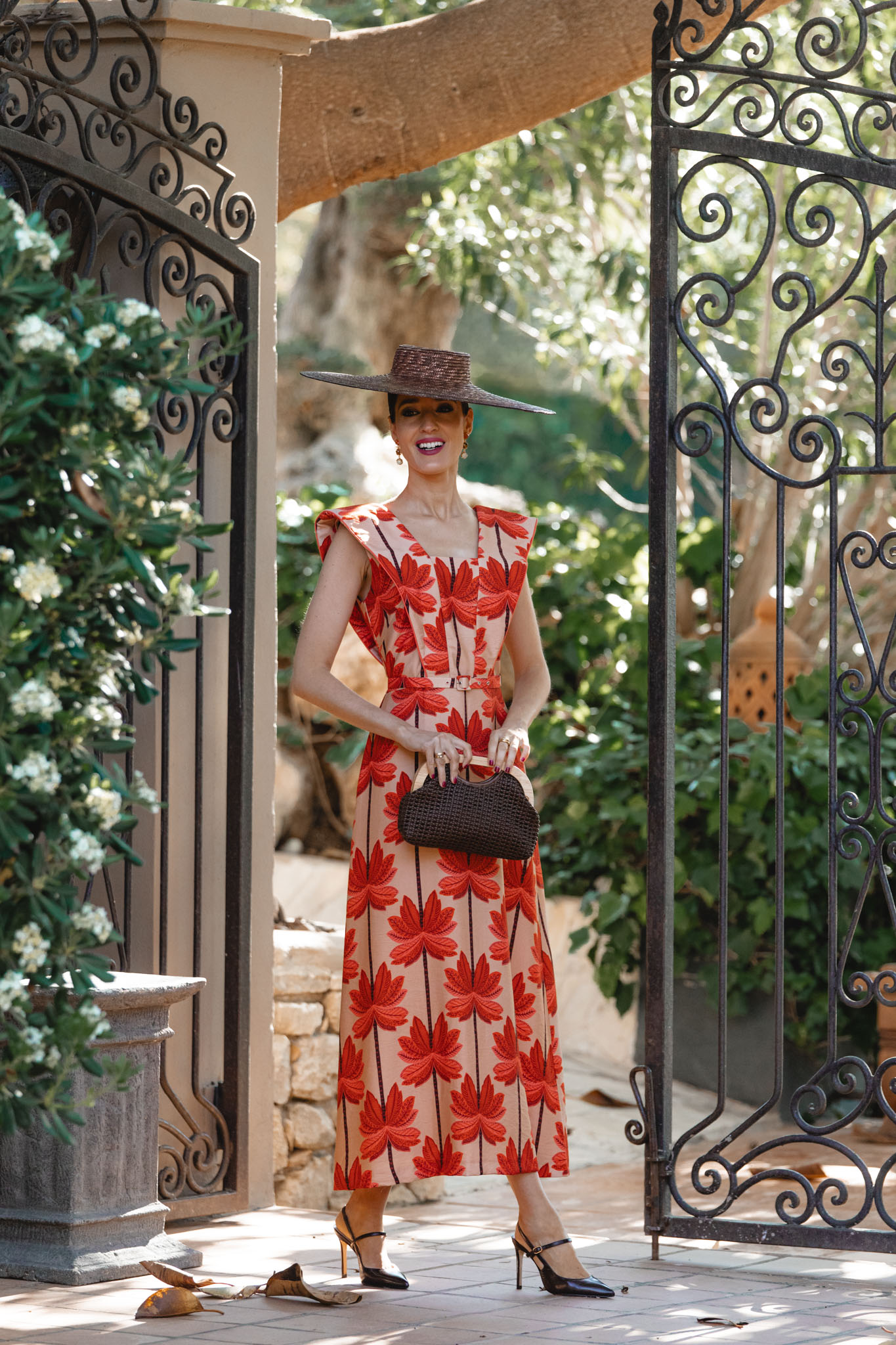 A la hora de elegir los accesorios, su paleta me ofreció un abanico enorme de posibilidades: naranja, nude, marrón o incluso burdeos. Finalmente me decanté por el marrón, una opción elegante y equilibrada: los zapatos de Magrit, el bolso de Masario y la pamela, también de Masario, que remata el conjunto con un toque sofisticado y muy de invitada de verano.