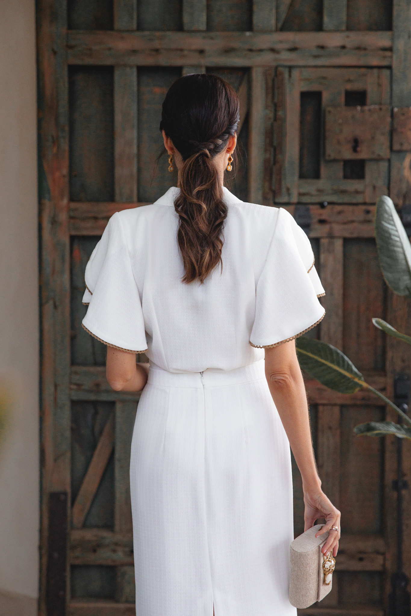 Qué os parece a vosotras.Conjunto blanco de dos piezas con mangas de volante y pespuntes tostados. - Mangas con volantes y ribete tostado en conjunto blanco para bautizo. Look de mamá de comunión con conjunto blanco y clutch en tonos nude. Look cómodo y elegante en blanco para mamás de comunión. Look blanco luminoso para mamá de comunión o bautizo. Botonadura frontal del conjunto blanco ideal para lactancia. Conjunto abotonado apto para lactancia para mamá de bautizo Conjunto blanco con inspiración safari para celebración infantil. Conjunto blanco con aire safari y pespuntes en camel. Falda blanca con pespuntes en camel para look de invitada. Look comunión o bautizo con conjunto de blusa y falda Conjunto blanco de Meryfor con accesorios en tonos naturales. Accesorios nude y camel combinados con conjunto blanco. Conjunto blanco con pespuntes tostados para comunión y bautizo Vista trasera del conjunto blanco con coleta baja con twist. Peinado de coleta baja pulida para evento de día. Pendientes en tonos tierra de Acus Complementos combinados con look blanco. Detalle del cuerpo abotonado del conjunto blanco de Meryfor. Clutch mini de rafia en tonos naturales para evento familiar. - Manga con volante y ribete tostado en conjunto blanco elegante. - Botonadura frontal del conjunto blanco ideal para lactancia. - Falda blanca con pespuntes en camel para look de invitada. - Detalle del tejido jacquard geométrico en blanco. - Look blanco luminoso para mamá de comunión o bautizo. - Accesorios nude y camel combinados con conjunto blanco. - Coleta baja con twist para estilismo de evento de día. - Conjunto blanco con inspiración safari para celebración infantil. - Zapatos nude y falda blanca con pespuntes tostados. - Clutch de rafia con detalle dorado para look de comunión. - Pendientes en tonos tierra combinados con conjunto blanco. - Detalle del volante en la manga del conjunto blanco. - Look cómodo y elegante en blanco para mamás de comunión. - Conjunto blanco de Meryfor con accesorios en tonos naturales. Si quieres, puedo prepararte también 25 ALT adicionales, o incluso asignarte qué ALT encaja mejor con cada foto según el orden en el que las vayas a subir al blog. Zapatos nude de Carolina Herrera para look de comunión.