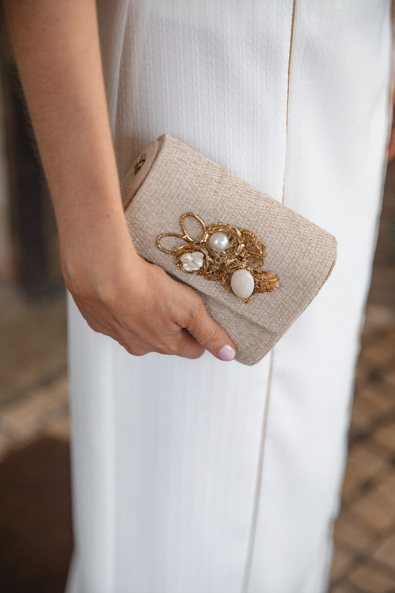 Para los accesorios, quise seguir la línea natural del conjunto y aposté por los tonos nude y camel. Elegí unos preciosos pendientes en tierras de Acus Complementos, zapatos nude de Carolina Herrera y una cartera mini en rafia de Occeanis, que mantiene esa armonía cálida y luminosa del look.