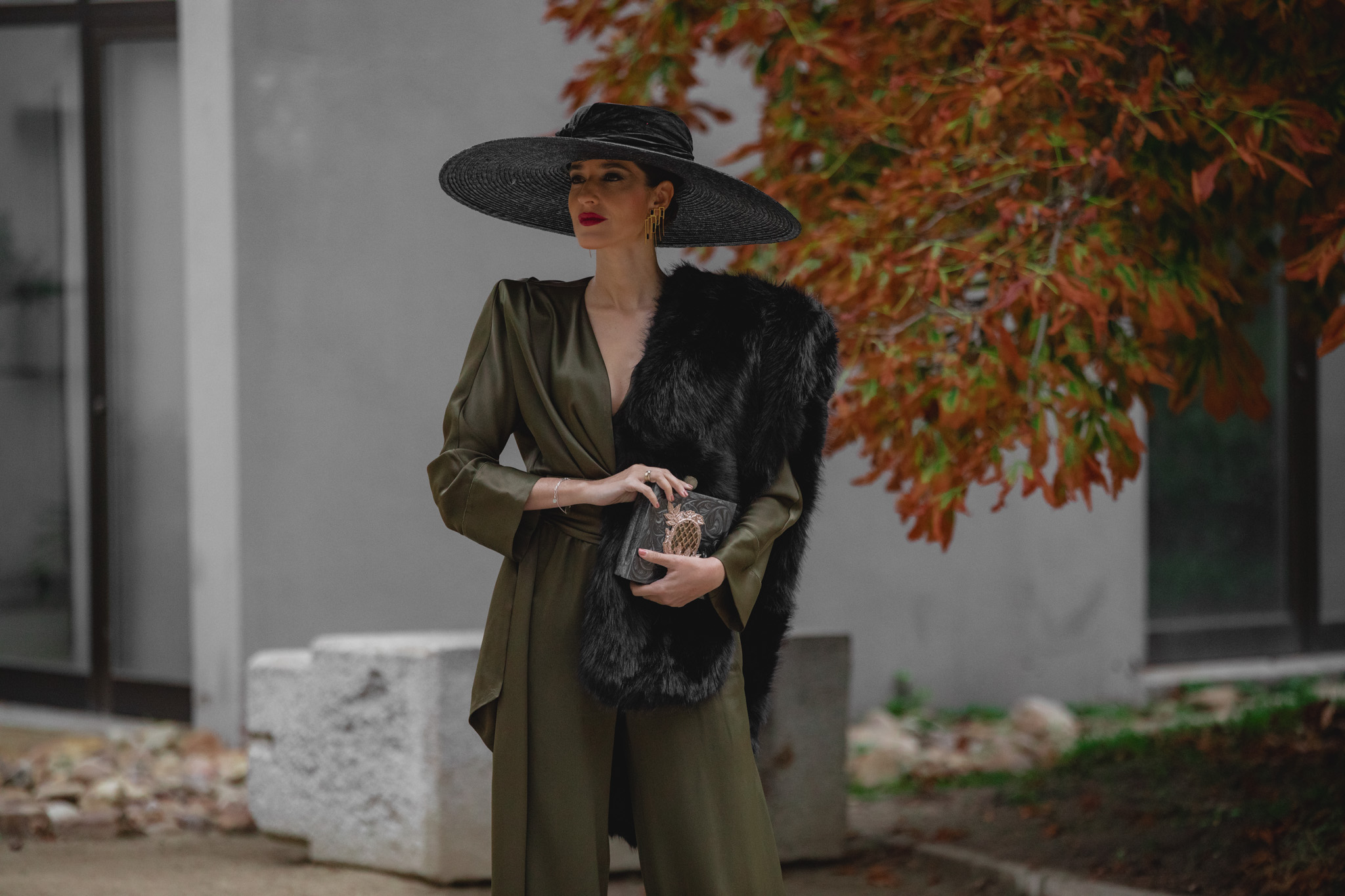 Lo que más me gusta de este tipo de monos es que son una opción perfecta para bodas de invierno, tanto de mañana como de tarde, ya que se pueden adaptar fácilmente según los complementos. Con la pamela de Masario —que además he hecho yo misma a partir de una base de canotier de ala ancha a la que añadí un turbante de terciopelo negro—, conseguimos un look de invitada de día elegante y con muchísima personalidad. El resultado no puede gustarme más: aporta ese toque de dramatismo que tanto favorece en los looks de invierno.