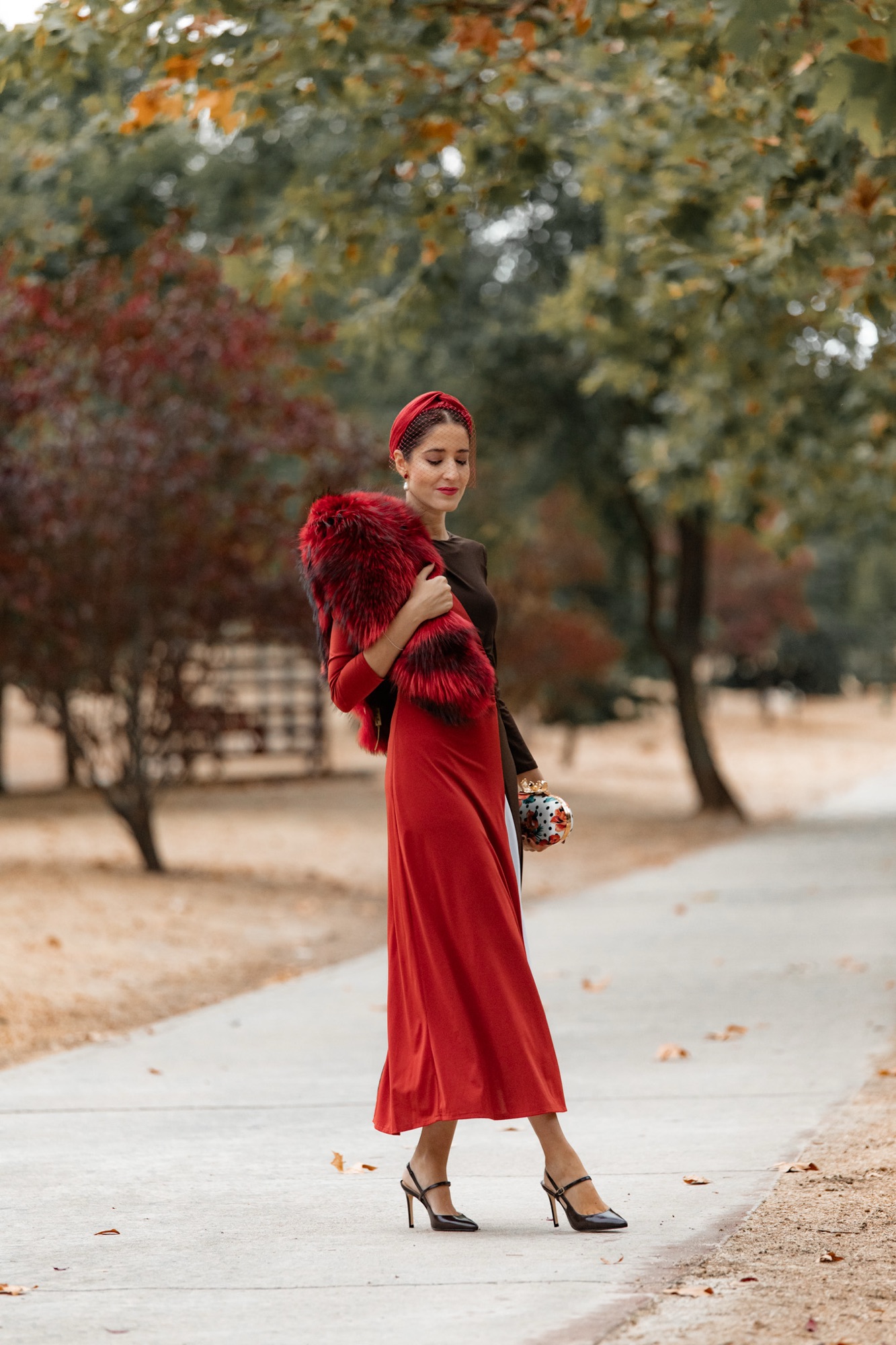 Y como en otoño no puede faltar un accesorio que, además de estilizar, abrigue, añadí una estola de De la Roca en rojo intenso que aporta un toque de glamour y eleva el resultado final.