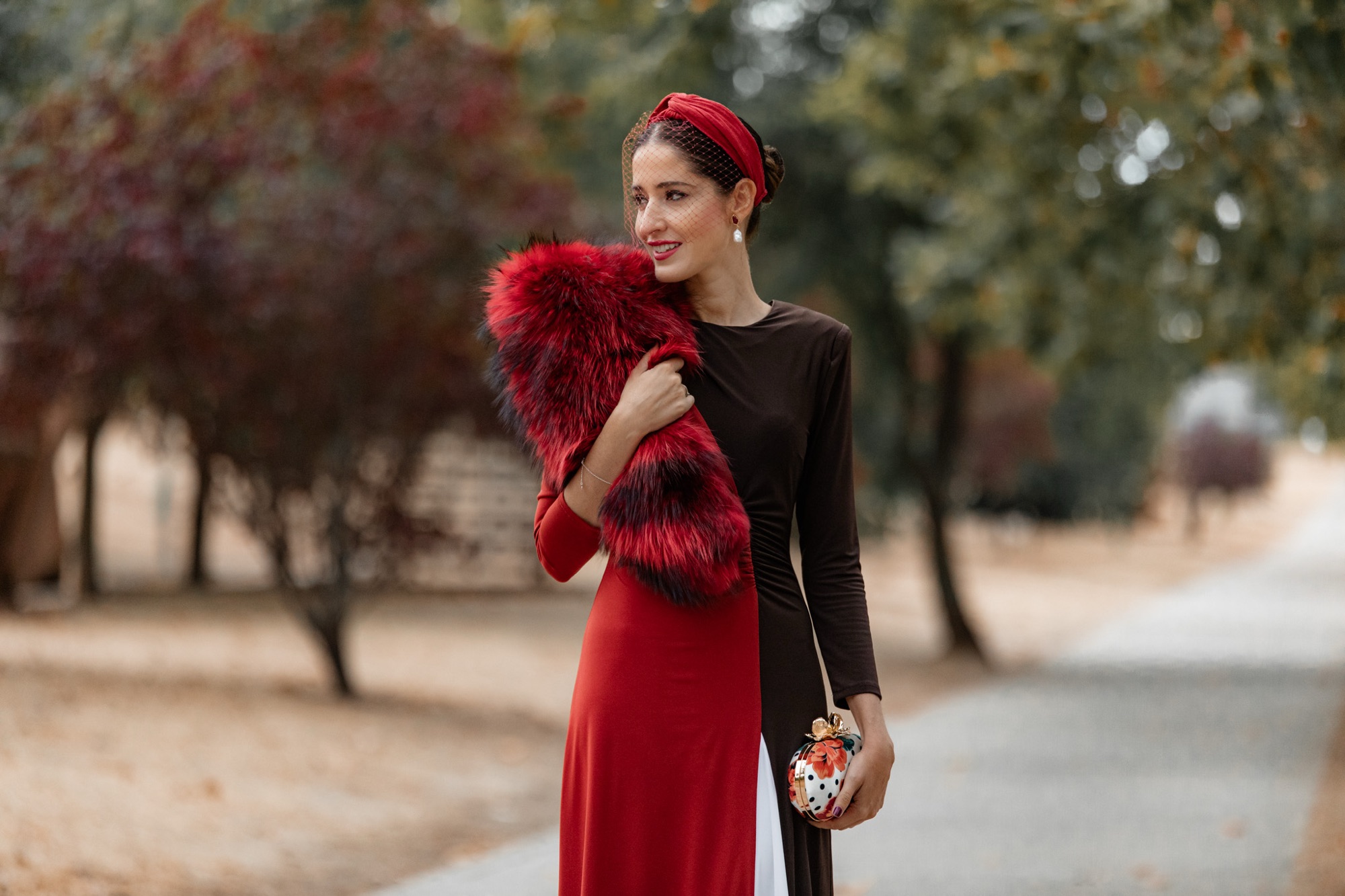 En esta ocasión lo combiné con una diadema tipo turbante de Marcela & Co en el mismo tono rojo, que aporta un toque romántico y refuerza la calidez del look. El bolso de Occeanis, con su estampado floral sobre fondo blanco, añade un punto de frescura y originalidad, mientras que los pendientes de Acus Complementos en blanco y rubí y los zapatos de Magrit en tono chocolate completan el conjunto con armonía y coherencia cromática.