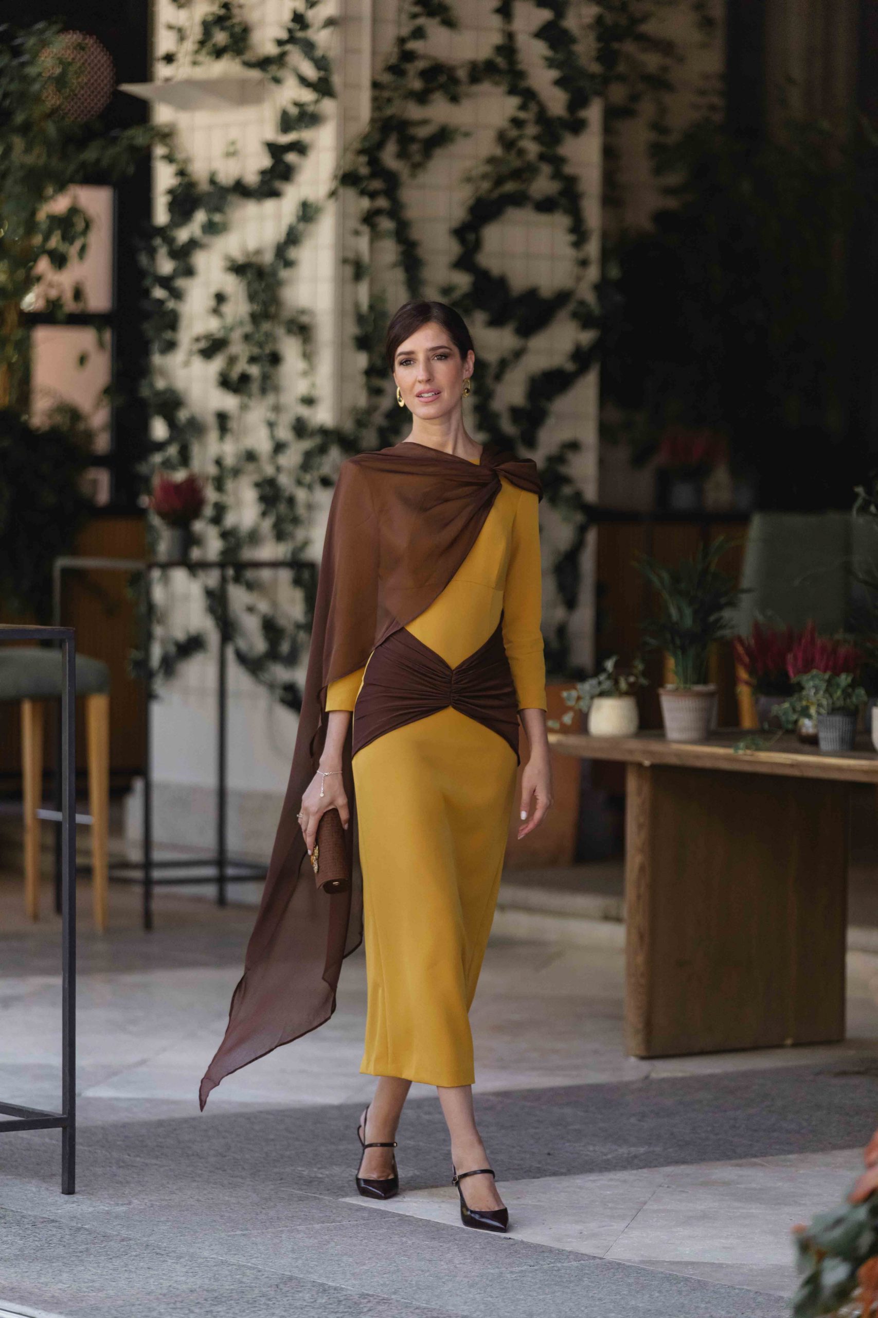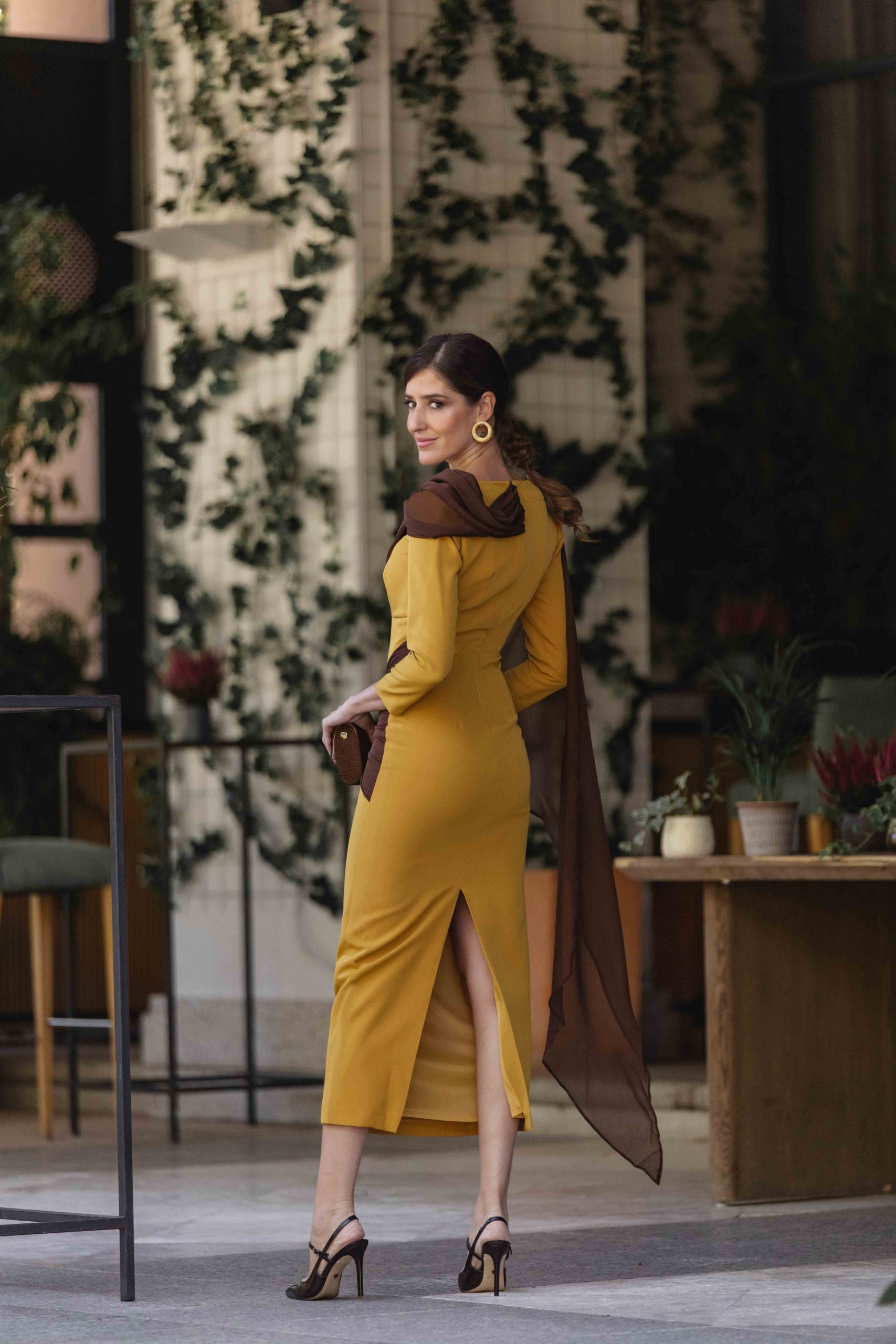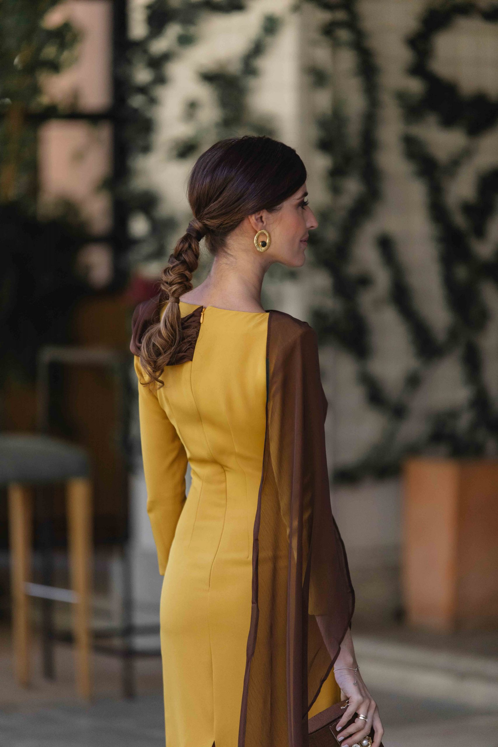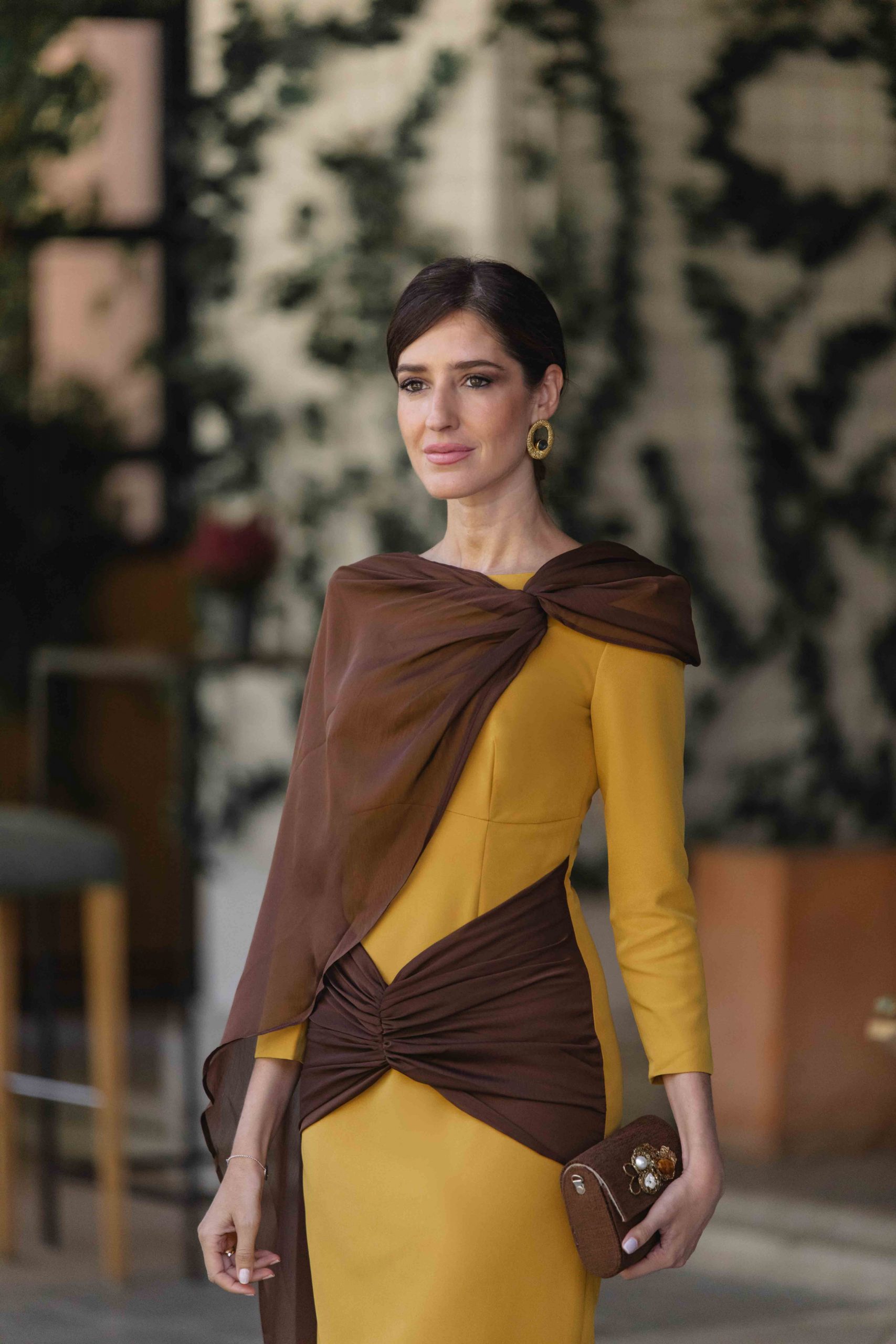 Hoy quiero enseñaros un nuevo look de invitada para bodas de mañana en otoño e invierno de esos que dejan huella. Porque jamás vi un vestido mostaza tan especial como este. Pertenece a la firma YSiempreMona, y me enamoré de él por la preciosa combinación de tonos, ya que el binomio con marrón me parece simplemente perfecto.