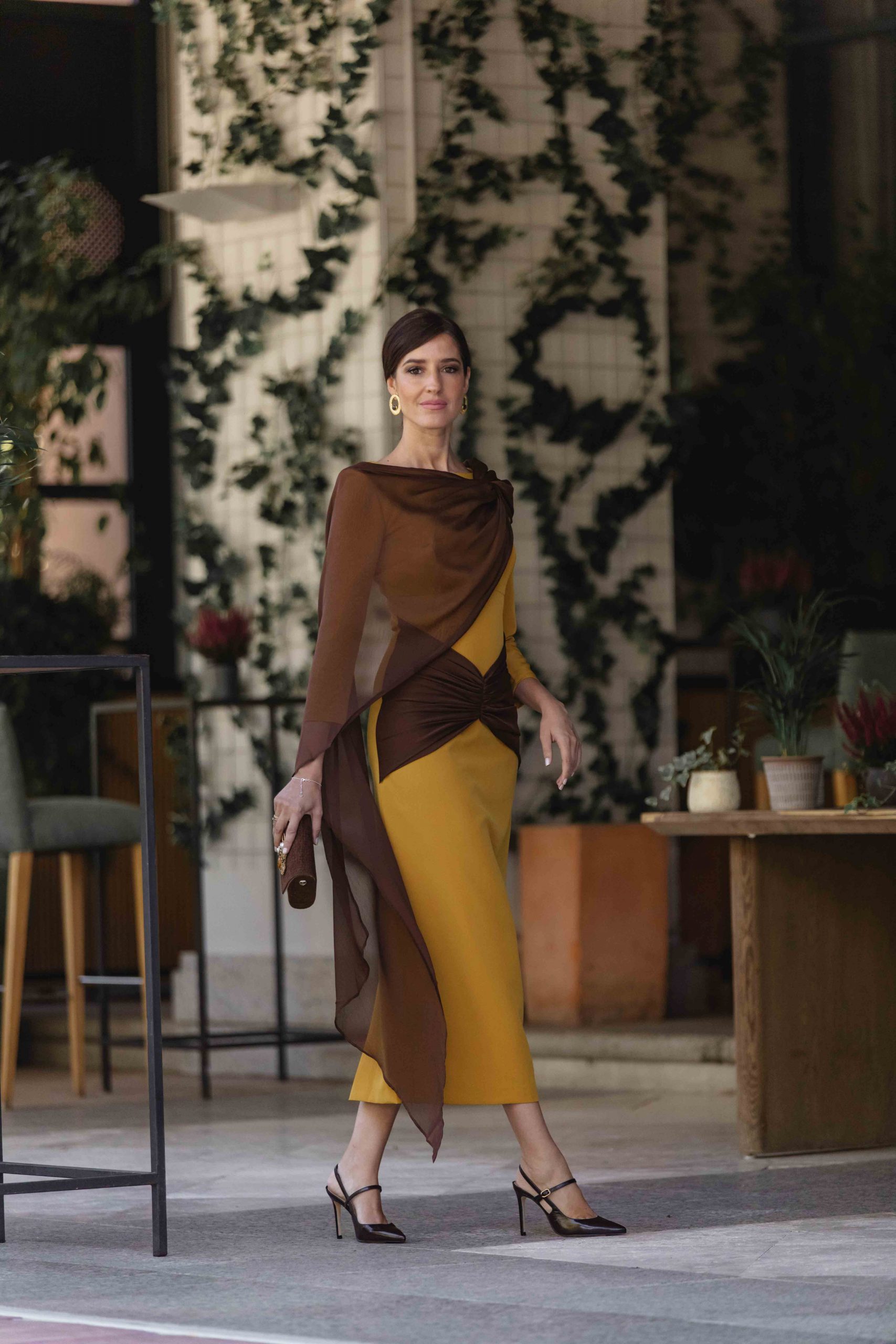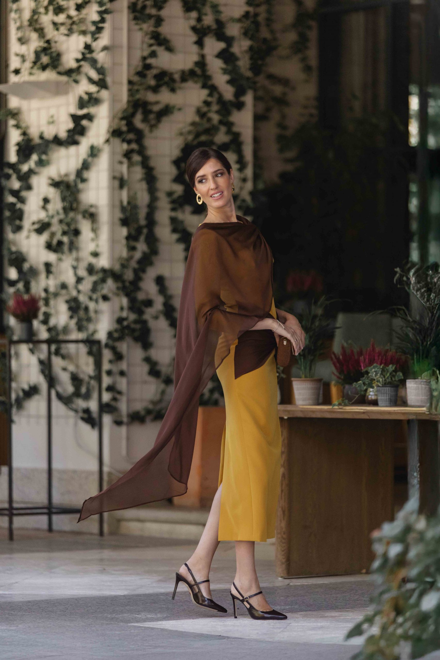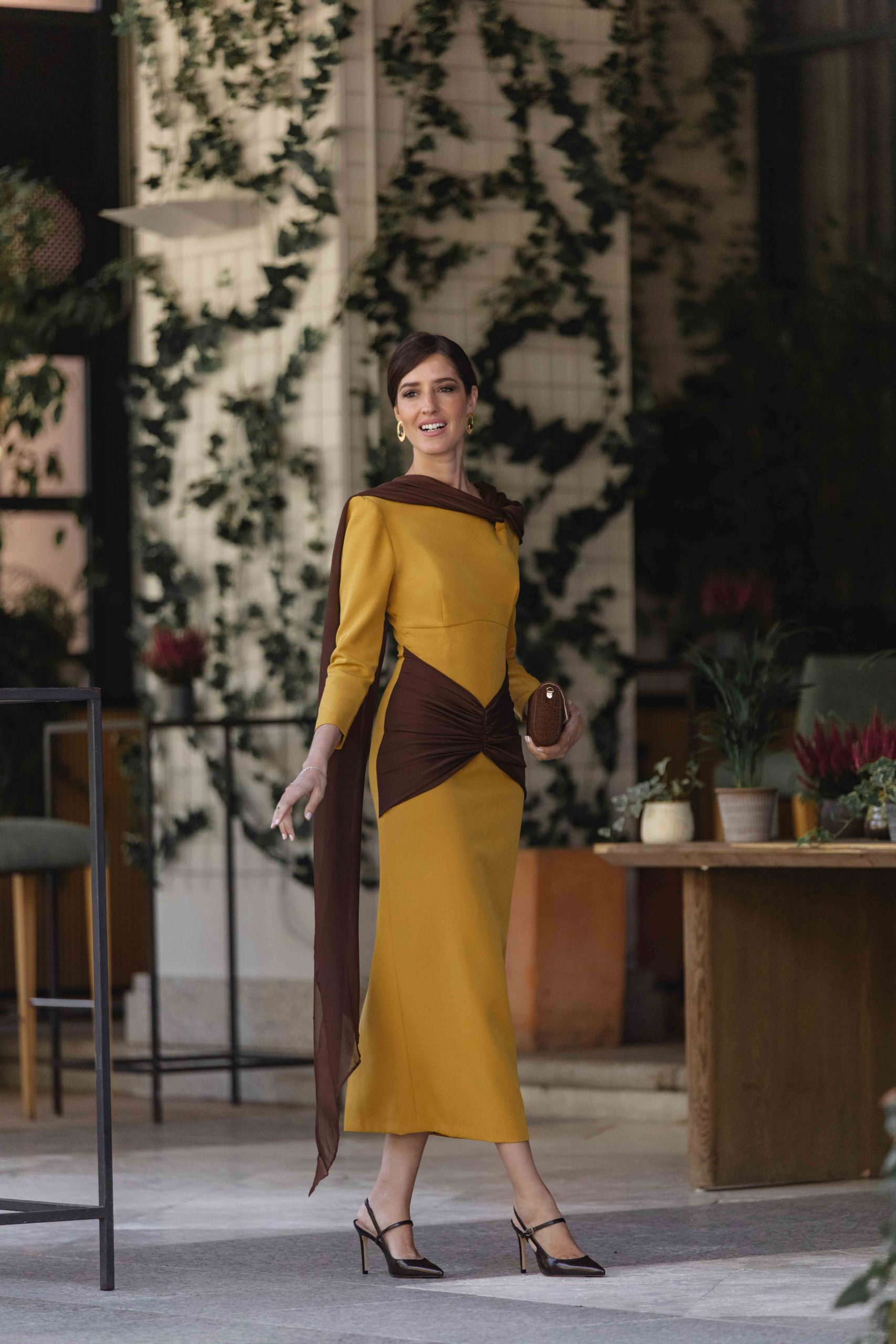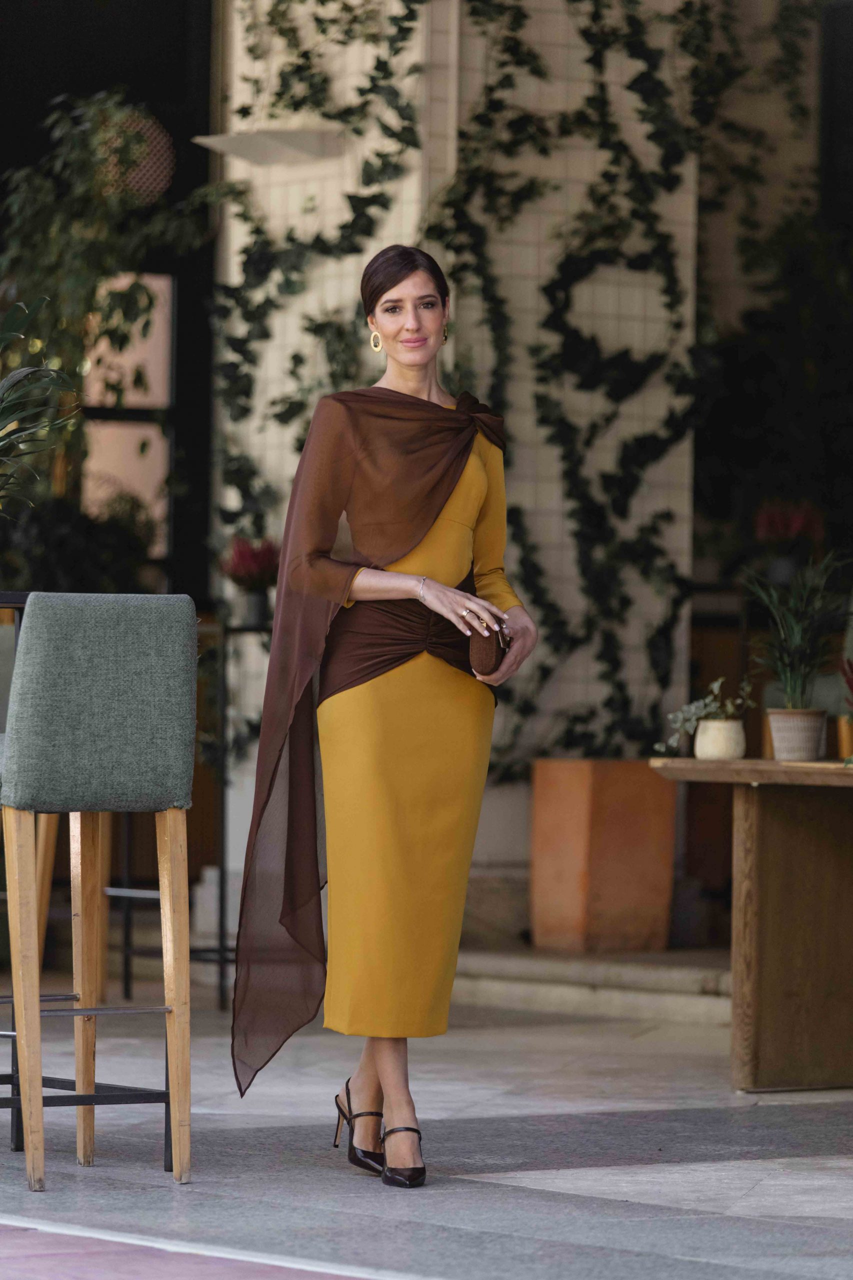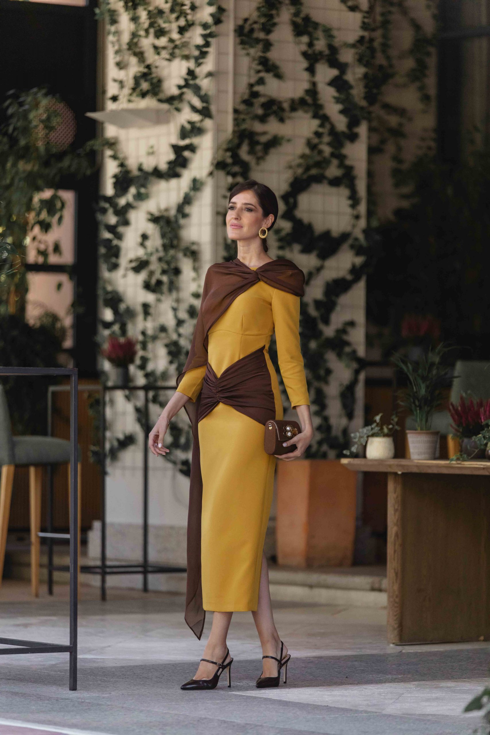 Hoy quiero enseñaros un nuevo look de invitada para bodas de mañana en otoño e invierno de esos que dejan huella. Porque jamás vi un vestido mostaza tan especial como este. Pertenece a la firma YSiempreMona, y me enamoré de él por la preciosa combinación de tonos, ya que el binomio con marrón me parece simplemente perfecto.
