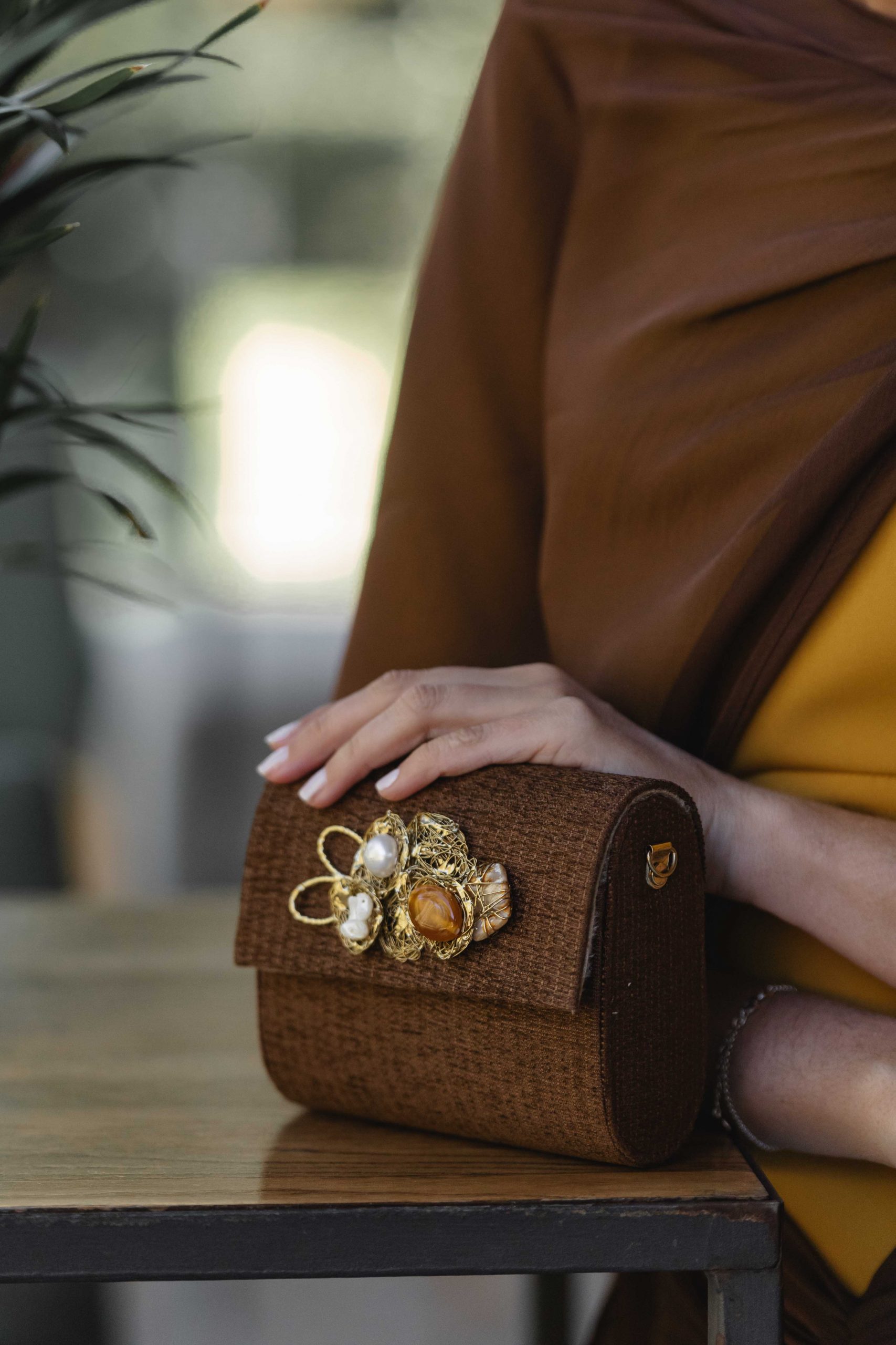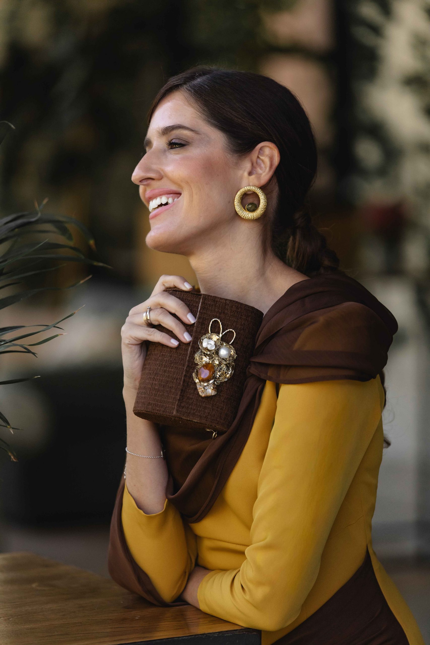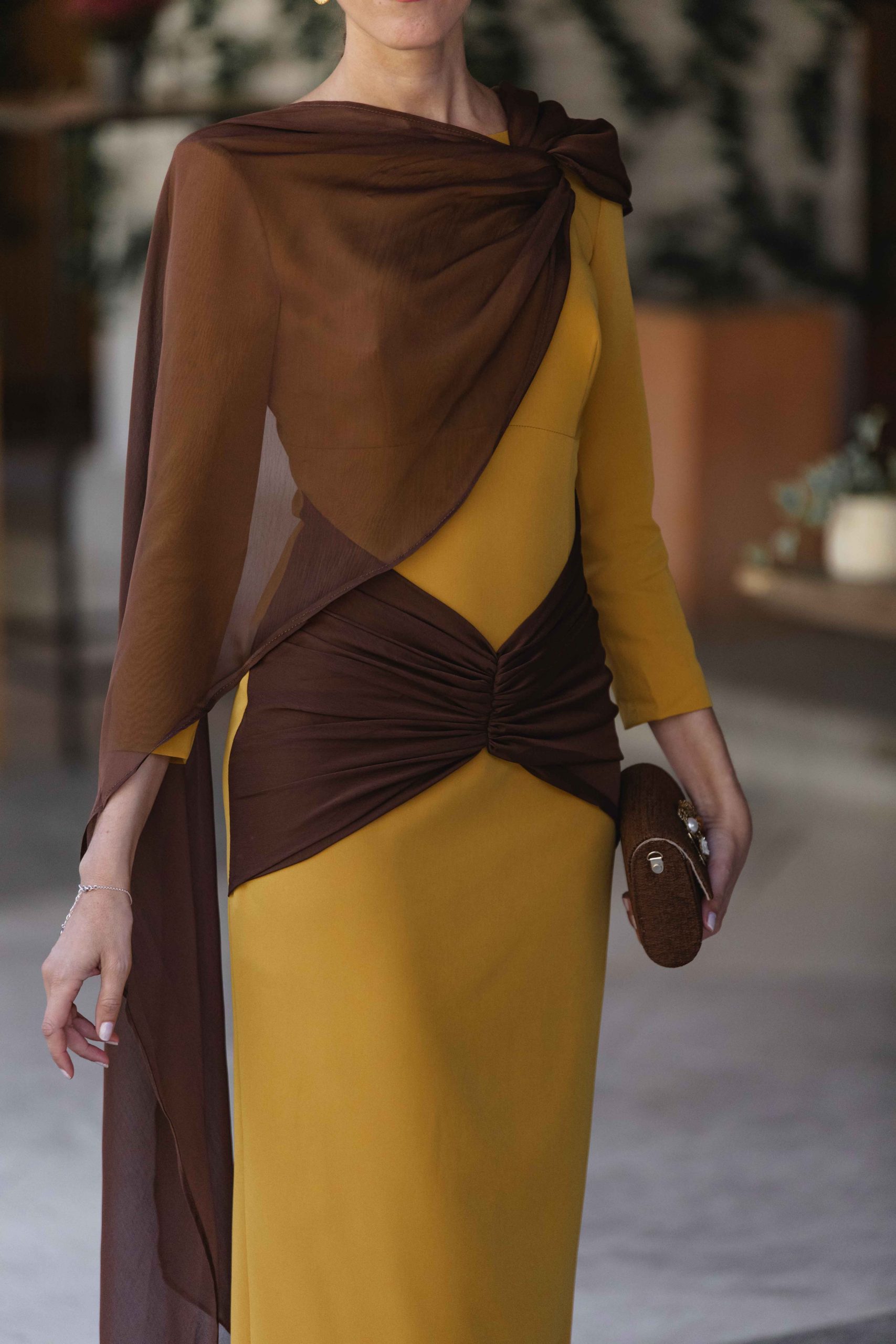 Detalle del vestido mostaza y marrón de Ysiempremona para boda de invierno