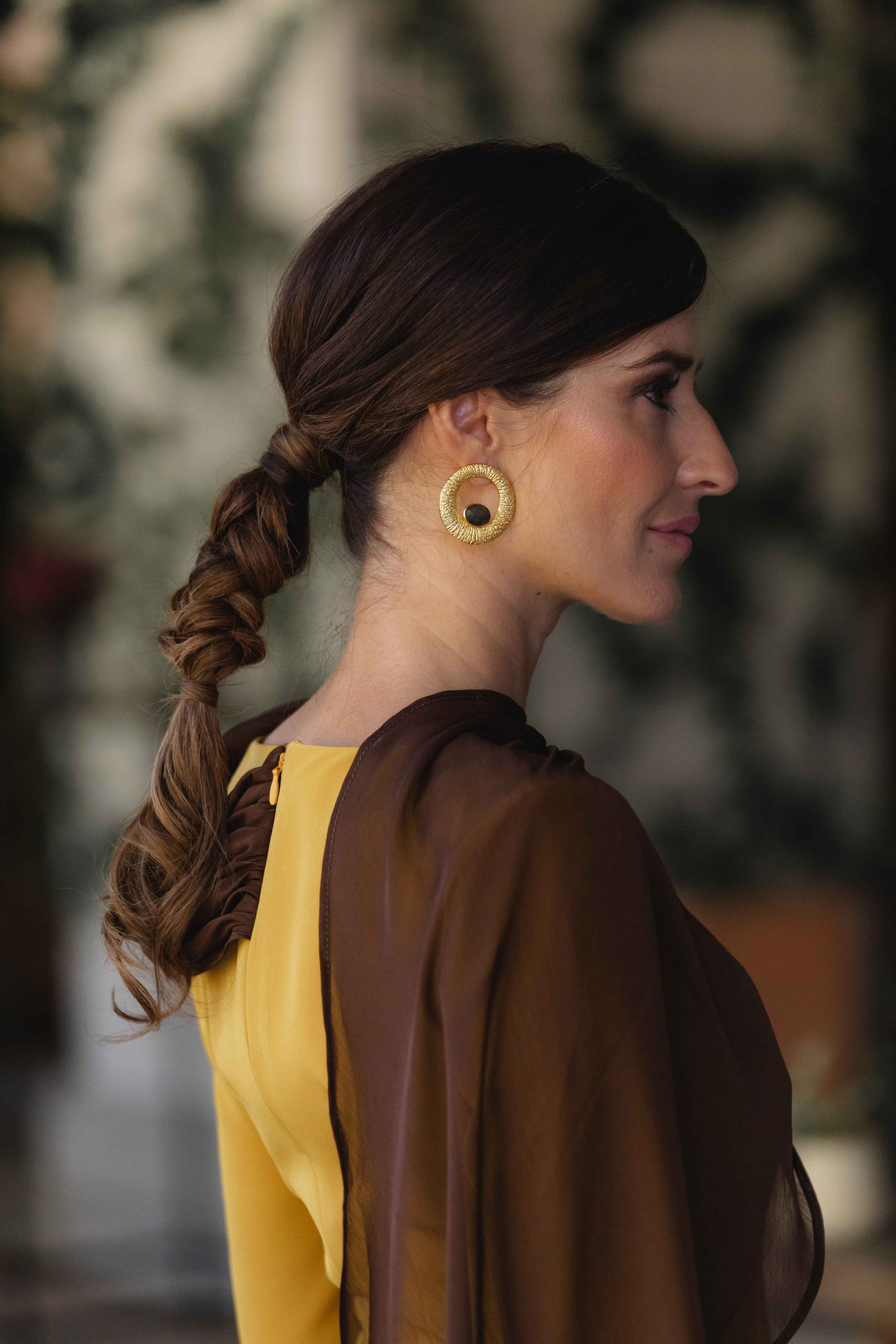 En cuanto a los accesorios, tuve claro que debían ir en marrón para mantener la armonía en el resultado final. Por eso elegí este precioso bolso de Occeanis, con detalles dorados que aportan un toque de brillo muy sutil. Los zapatos de Magrit, también en marrón, son ese tipo de básico elegante que nunca falla. Y el único toque de color lo ponen los pendientes de Acus Complementos, con su piedra labradorita, que reflejaba la luz de una forma preciosa.