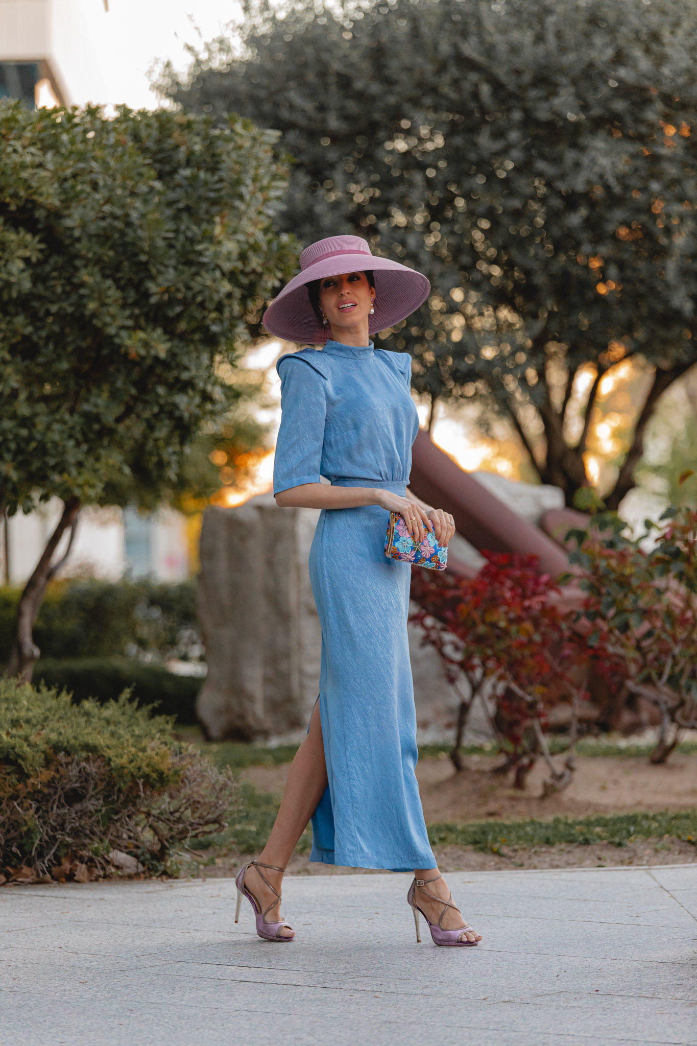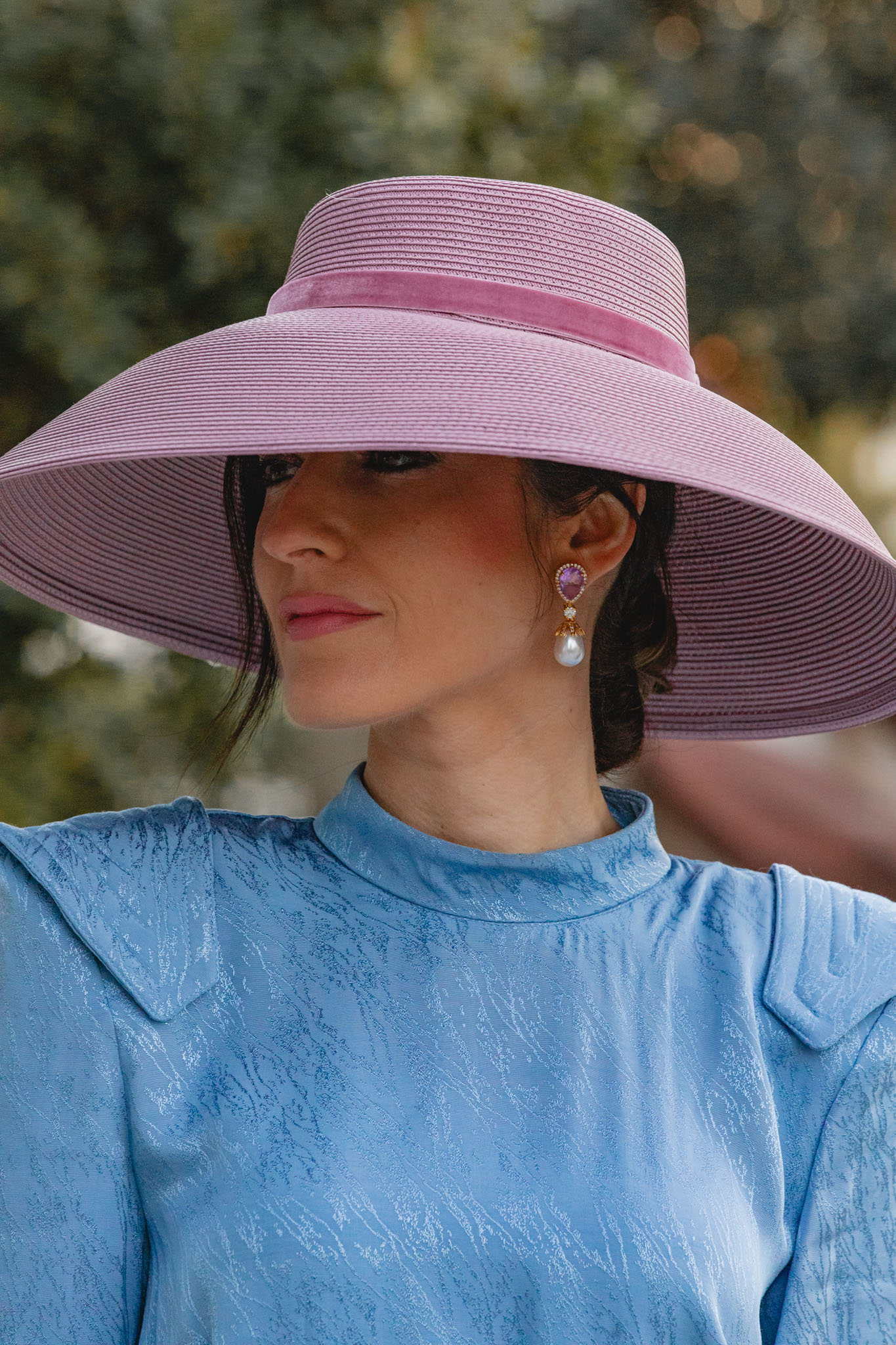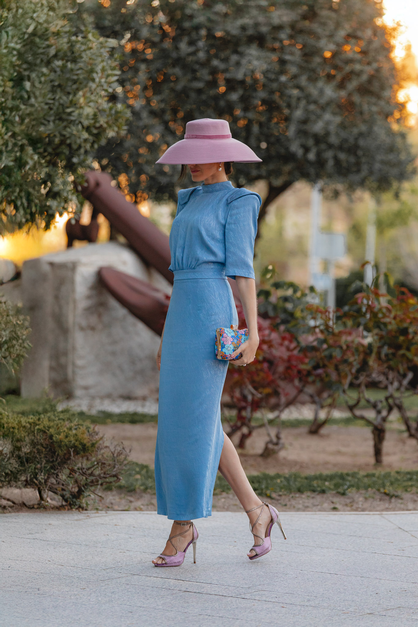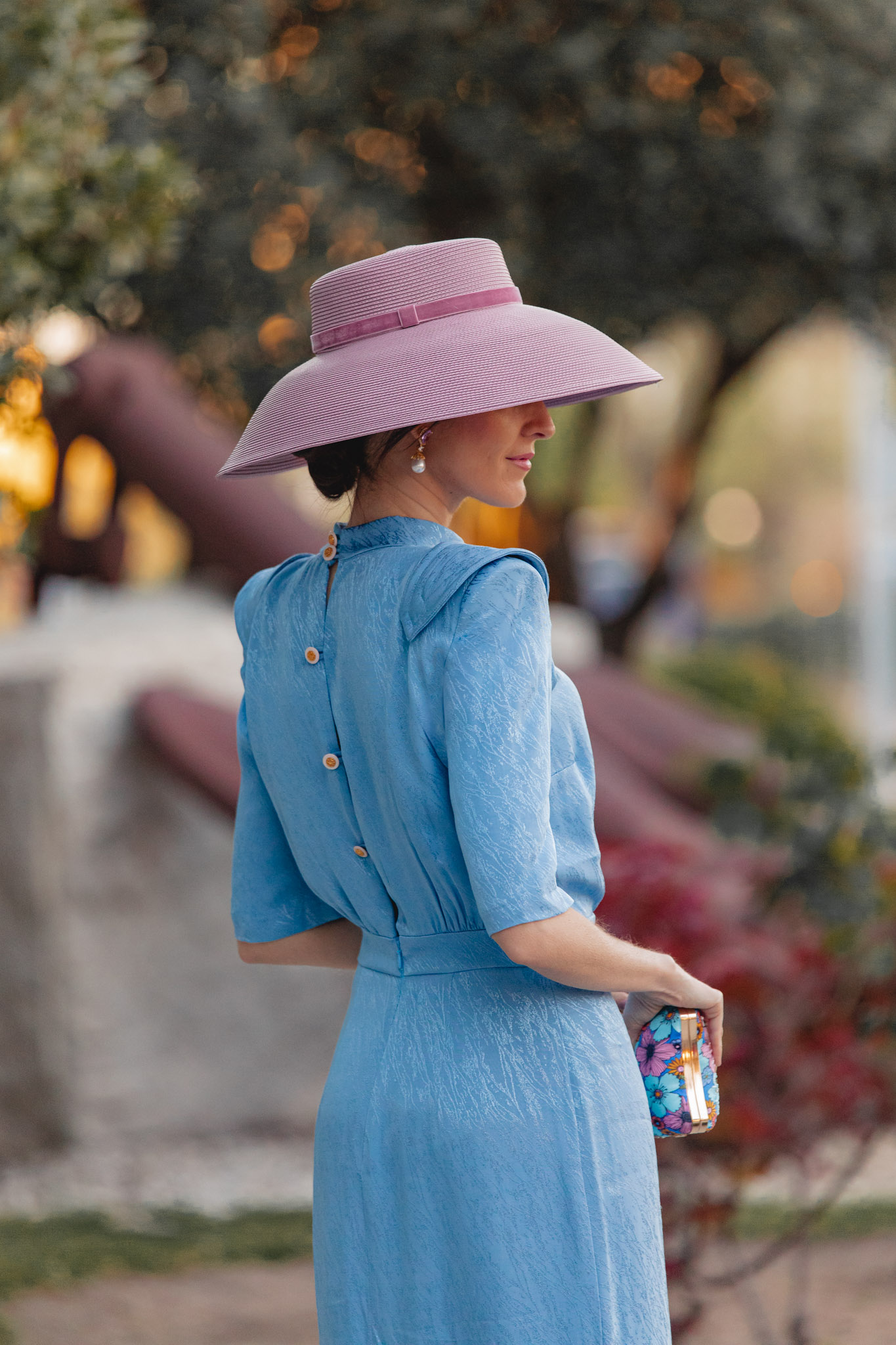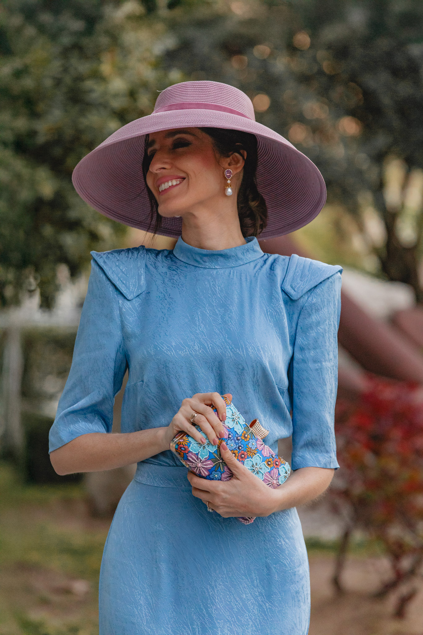 Para los accesorios, la auténtica protagonista es esta pamela de aire retro de Marcela and Co, que aporta un toque muy especial al look. Su color, entre rosa y malva, lo hace aún más único. Y si sois de las que necesitáis llevar gafas de sol siempre, esta opción es ideal: no os saltaréis el protocolo y además sumaréis un punto muy chic al estilismo.