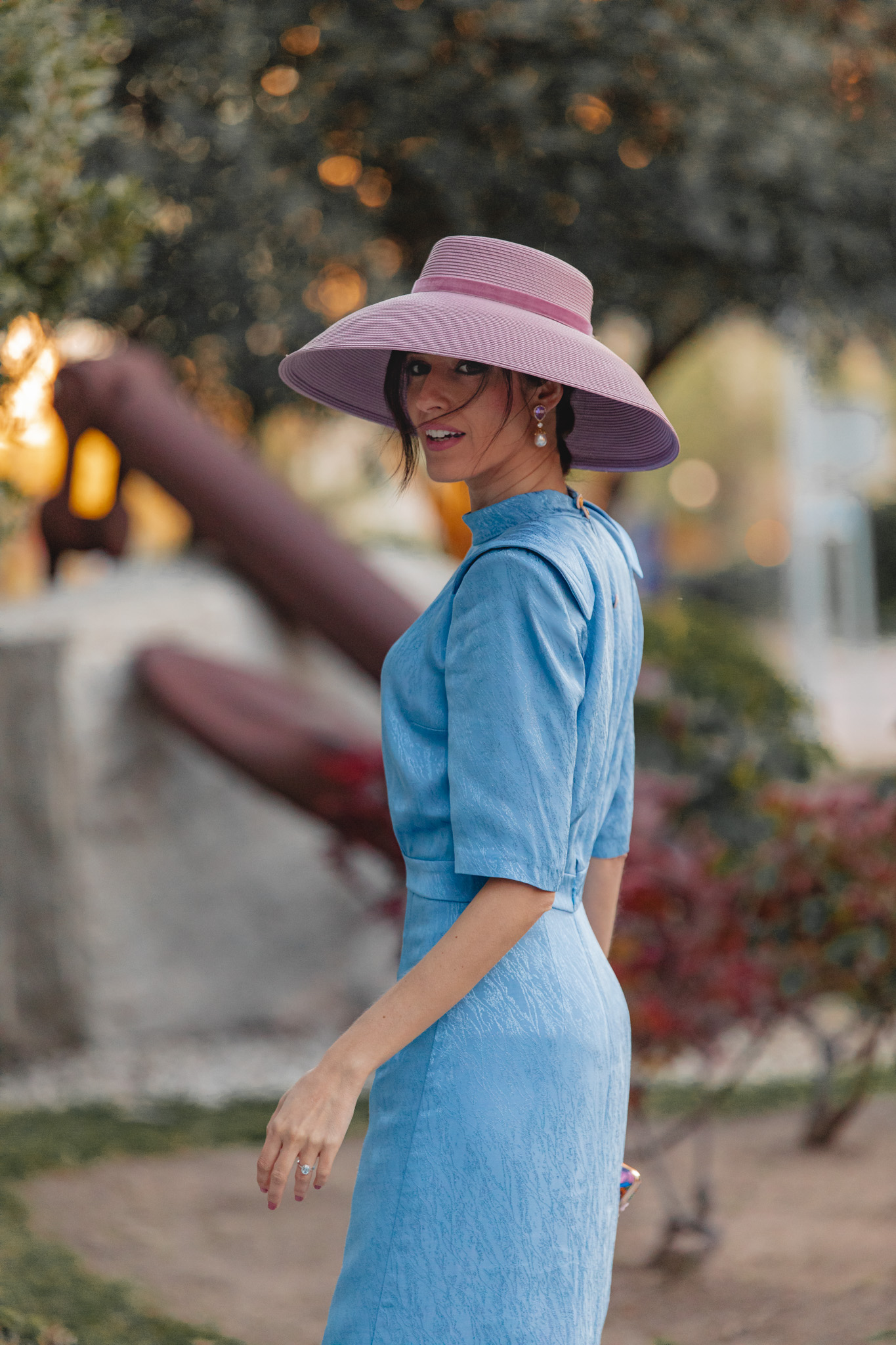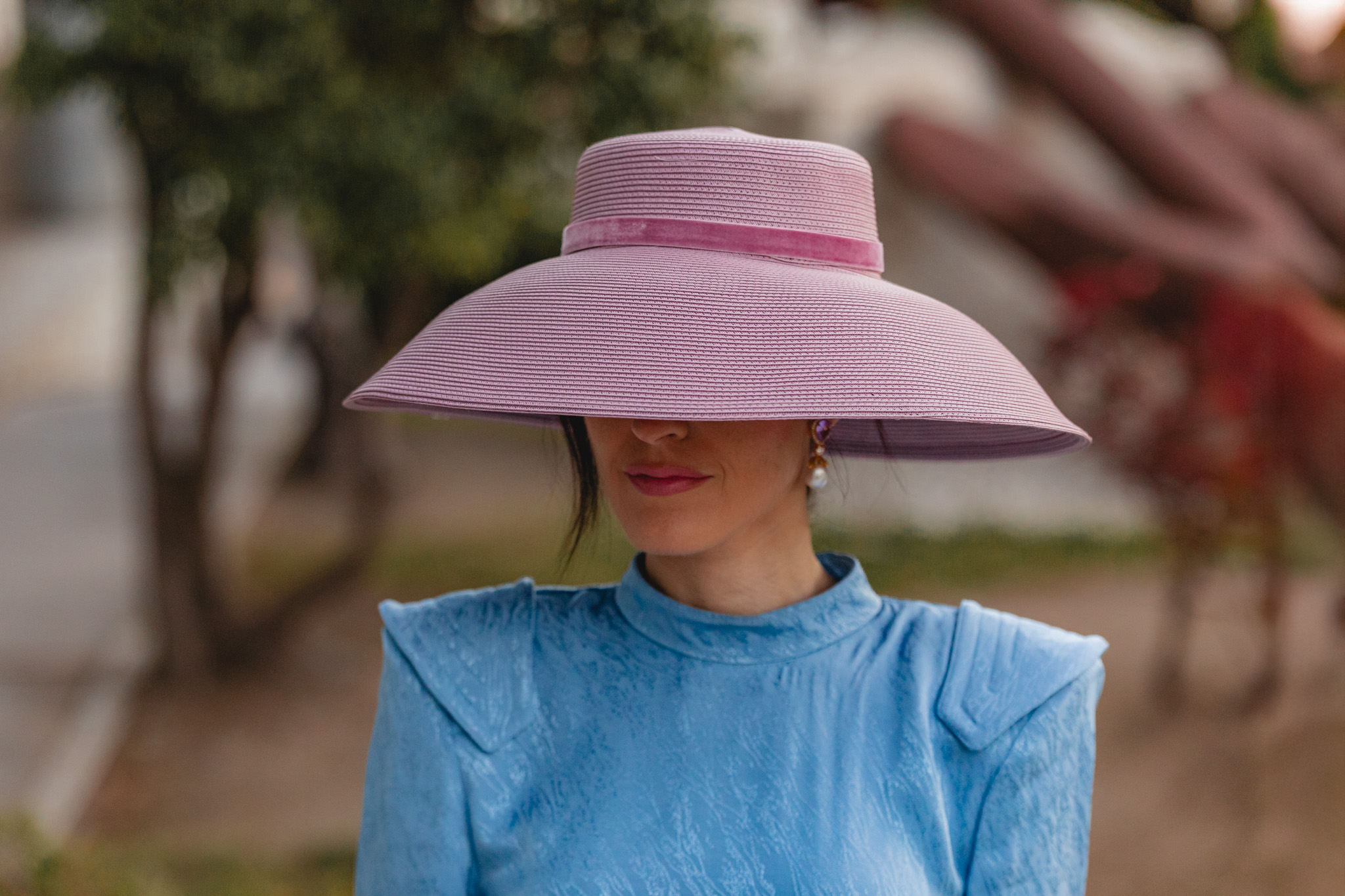 En cuanto al beauty, aposté por una piel luminosa y natural, con mejillas ligeramente marcadas y labios en un tono suave que no compite con el color del vestido. El recogido desenfadado fue clave para equilibrar la estructura del vestido y la presencia de la pamela: fresco, ligero y con ese punto effortless que siempre suma en looks de inspiración vintage.