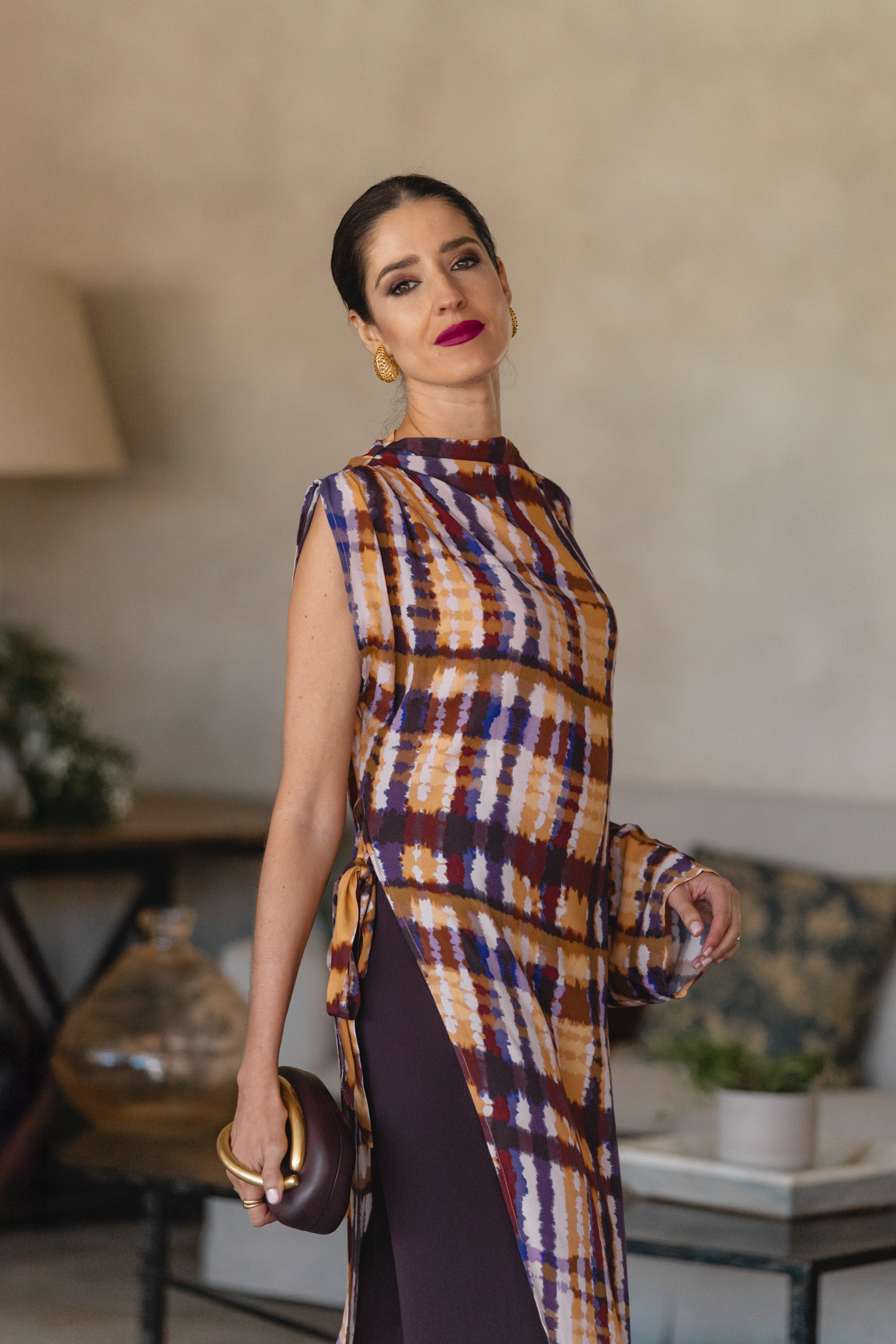 Look de invitada con blusón estampado y pantalón berenjena en espacio cálido Invitada con blusón anudado y pantalón berenjena en interior decorado Look cómodo y diferente con túnica colorida y pantalón morado Túnica estampada de Vogana con movimiento y pantalón morado oscuro 	Invitada con túnica fluida, pantalón berenjena y clutch burdeos