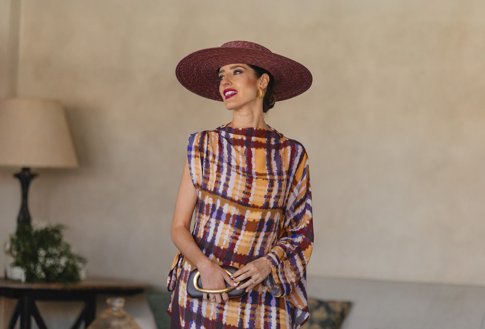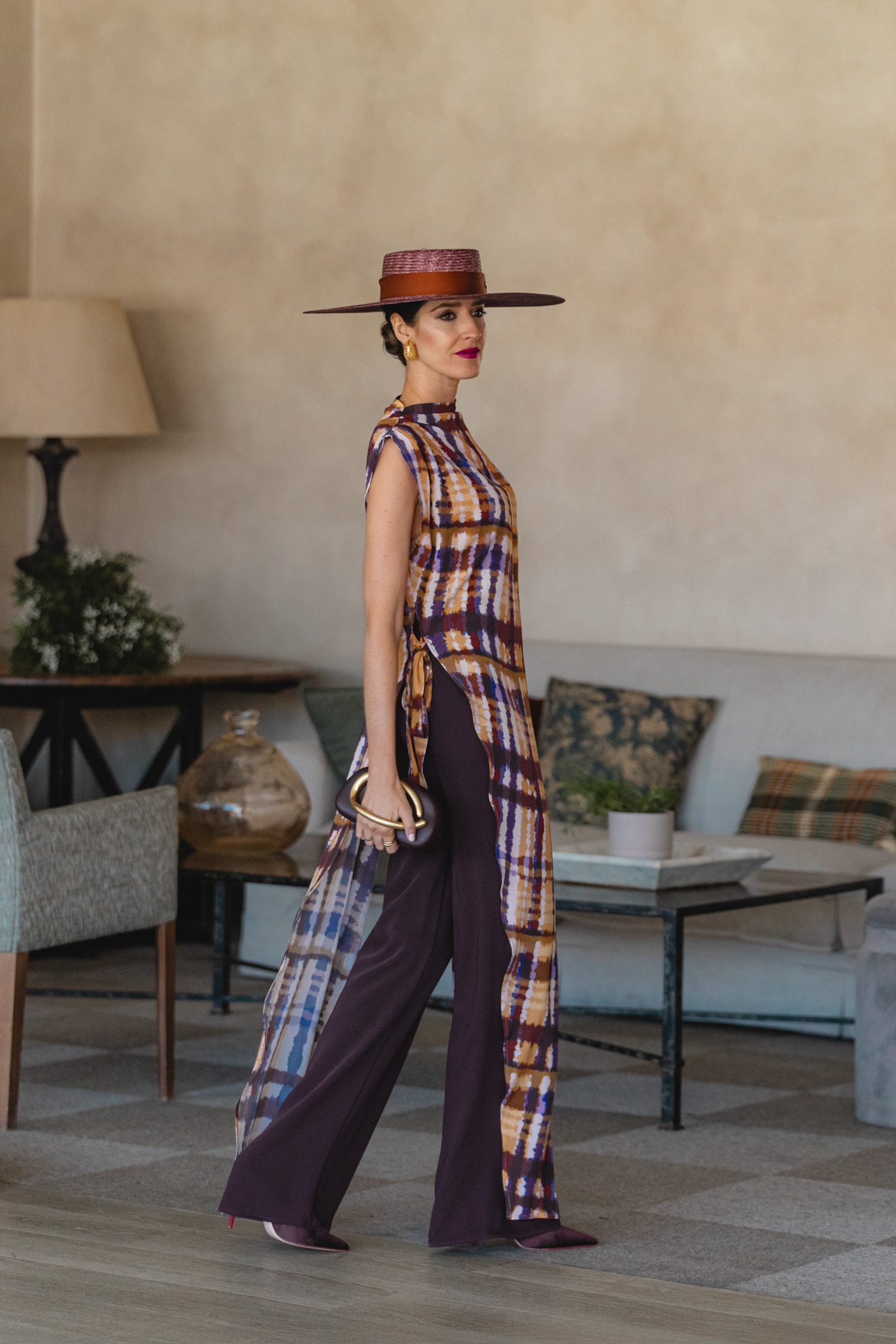Conjunto de invitada con túnica estampada y clutch burdeos Túnica estampada en tonos cálidos combinada con pantalón ancho Invitada con conjunto estampado y pamela malva en interior elegante Invitada con conjunto fluido en tonos mostaza, morado y marrón