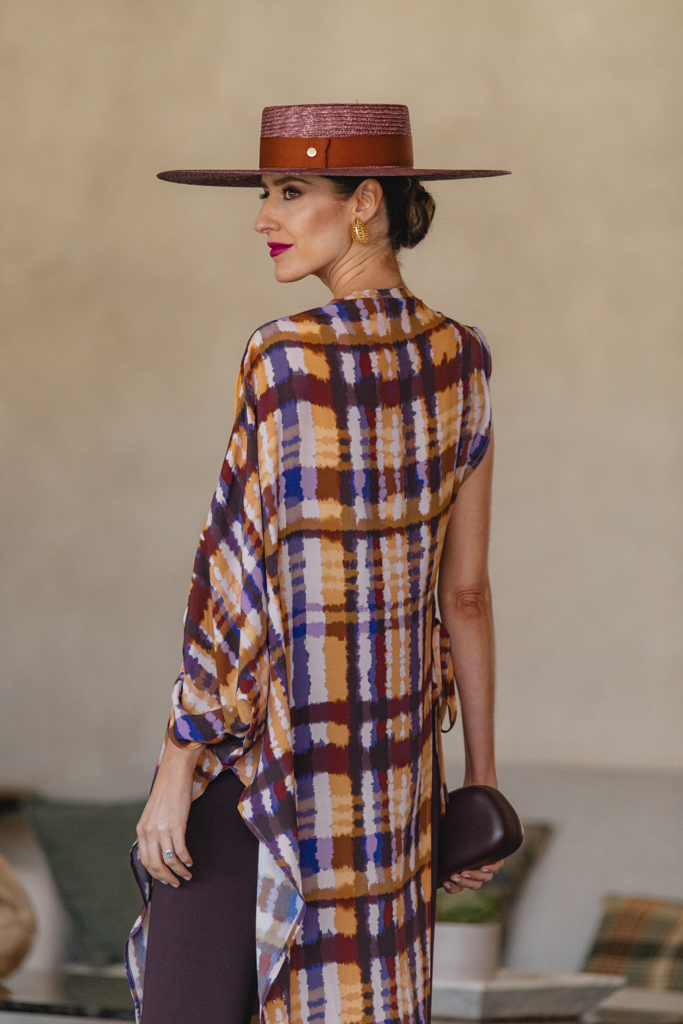 Túnica estampada con pamela malva y pantalón berenjena - Look de invitada con túnica colorida y pamela de Masario