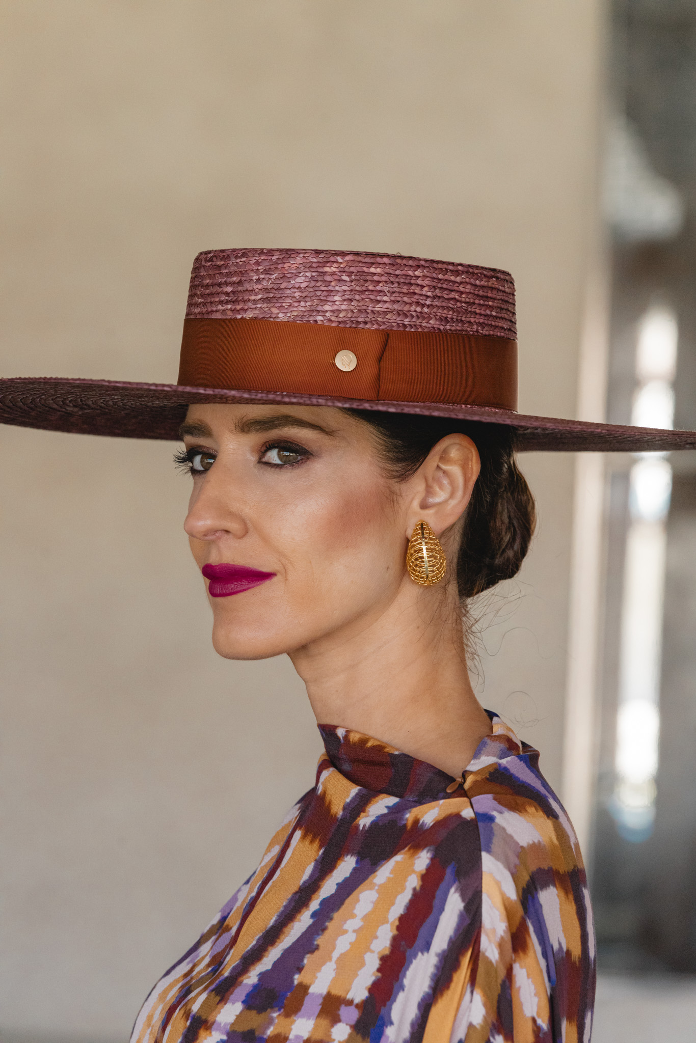Para el beauty,  aposté por una piel luminosa, mejillas ligeramente marcadas y labios en un tono burdeos que siguiera las tonalidades del conjunto. En los ojos, sombras cálidas en marrones y cobres suaves, con pestañas definidas para abrir la mirada sin recargar. El peinado lo mantuve sencillo, con un recogido relajado que deja protagonismo al diseño y a la pamela.