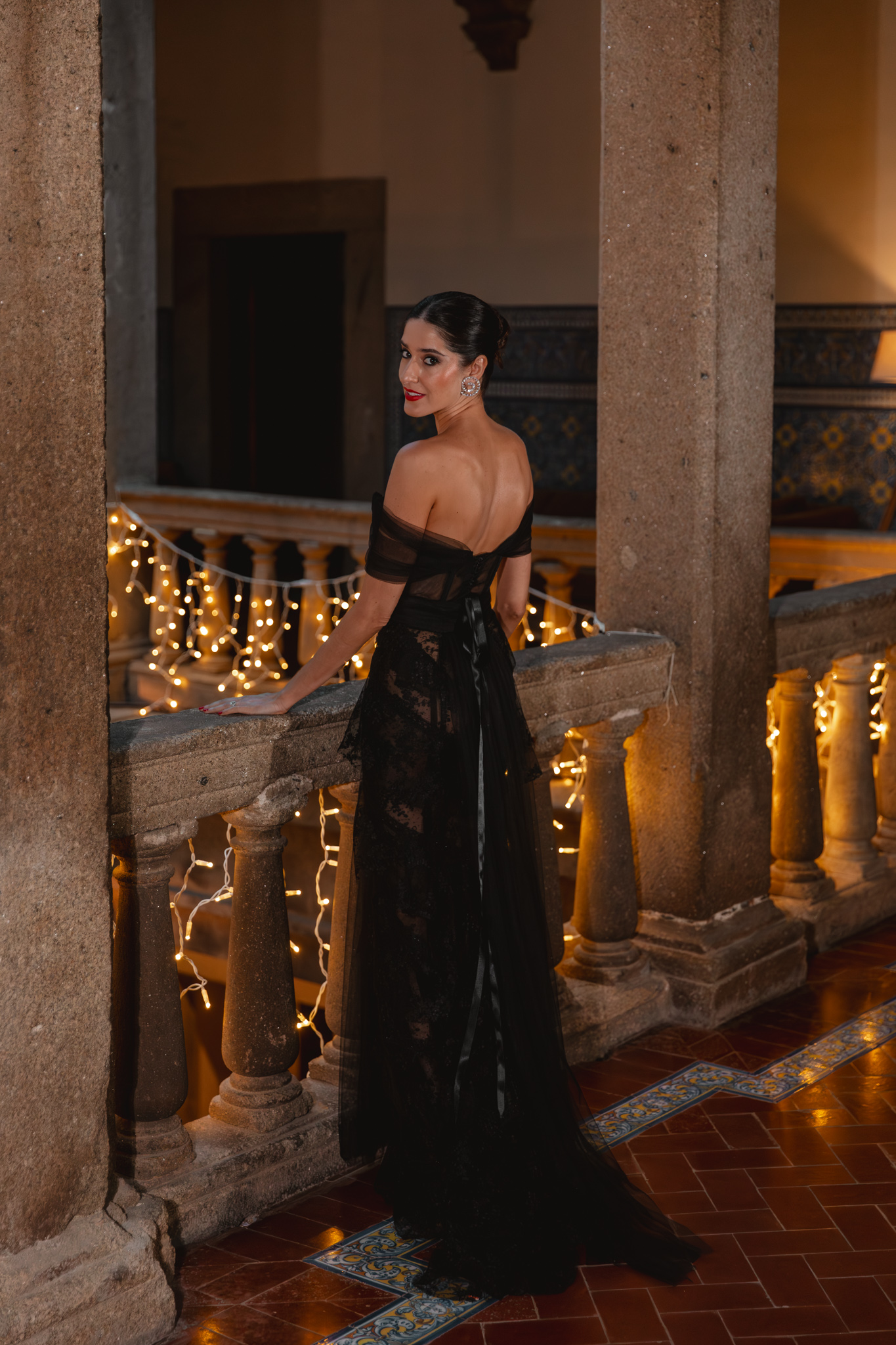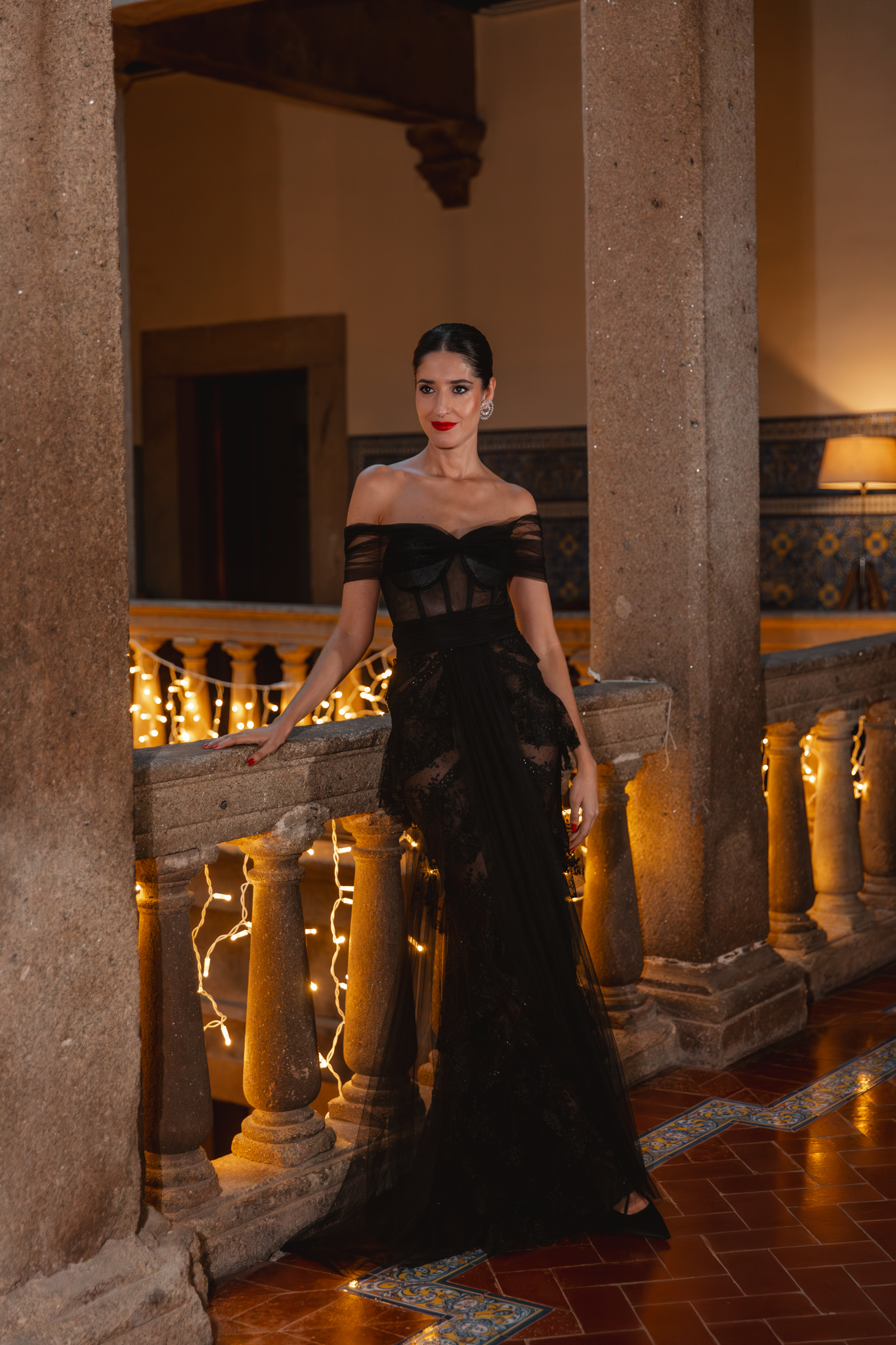 El diseño partía de un bustier estructurado, con cuerpo envarillado, que define la silueta de forma impecable. A partir de ahí, la falda de encaje de chantilly con volantes aporta ligereza y movimiento, creando un contraste precioso entre estructura y fluidez. El tul cobra especial protagonismo a través de una sobrecapa que nace en los hombros, casi como una capa etérea, y que deja entrever la piel de forma sutil. Un juego de transparencias elegantes rematado con un fajín en la cintura que equilibra el conjunto y realza la figura.