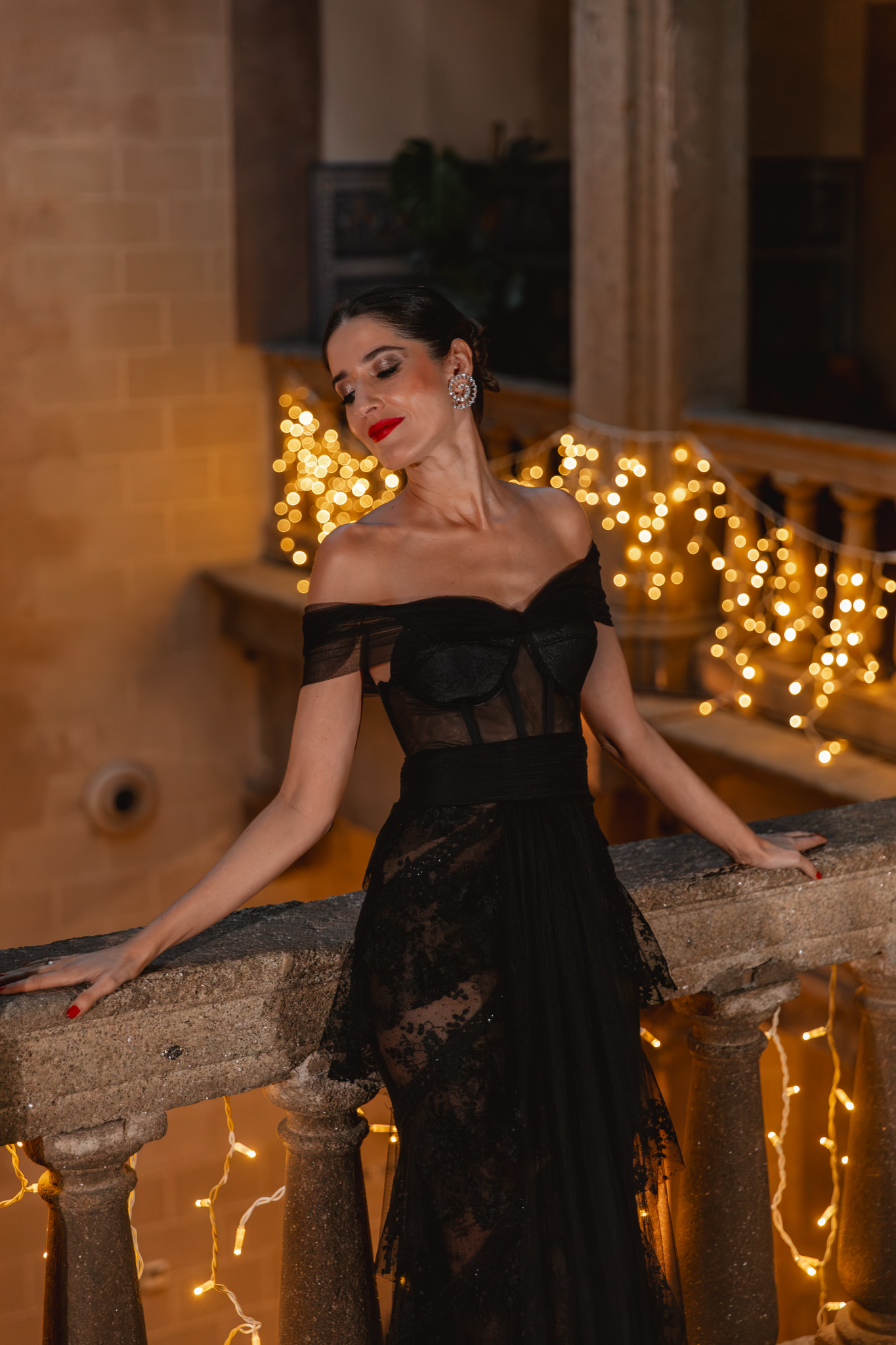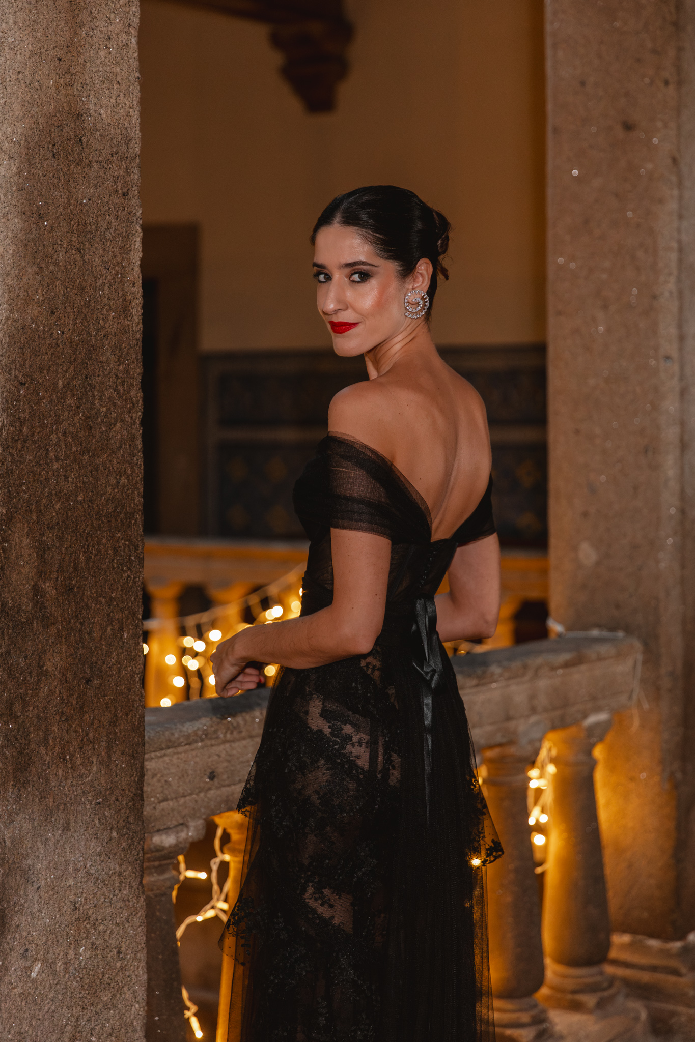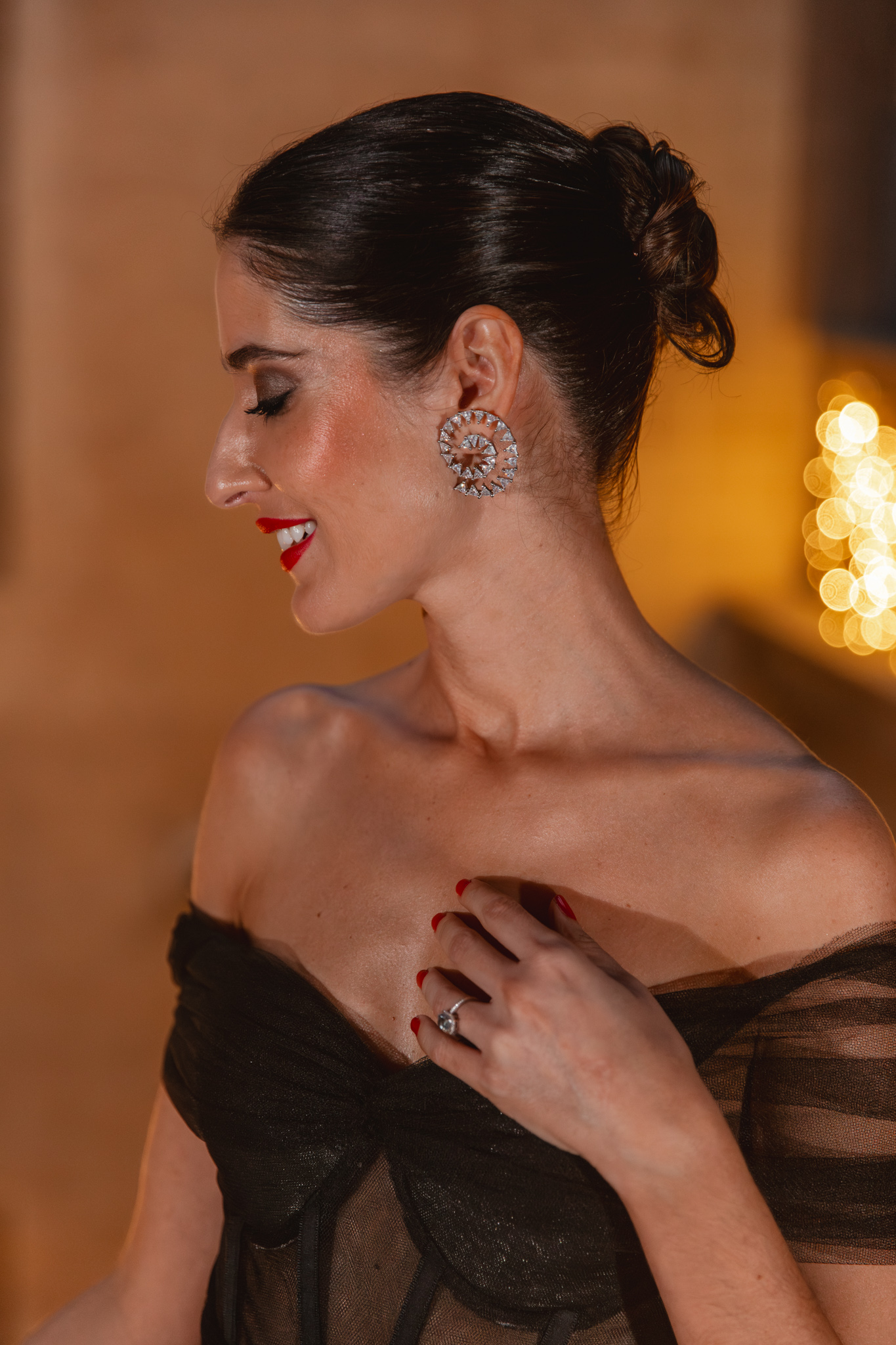 En cuanto a los complementos, la idea fue la misma: piezas que acompañaran el vestido sin robarle protagonismo. Para los pies aposté por los zapatos Zowa-Te de Lodi, confeccionados en raso y con un delicado detalle joya en el empeine, elegantes, especiales y, sobre todo, muy cómodos para una noche tan larga. Como toque final, los pendientes Reata de Acus Complementos, un diseño en espiral con brillo sutil que iluminaba el rostro sin resultar excesivo y aportaba ese punto de luz tan favorecedor ante cámara.